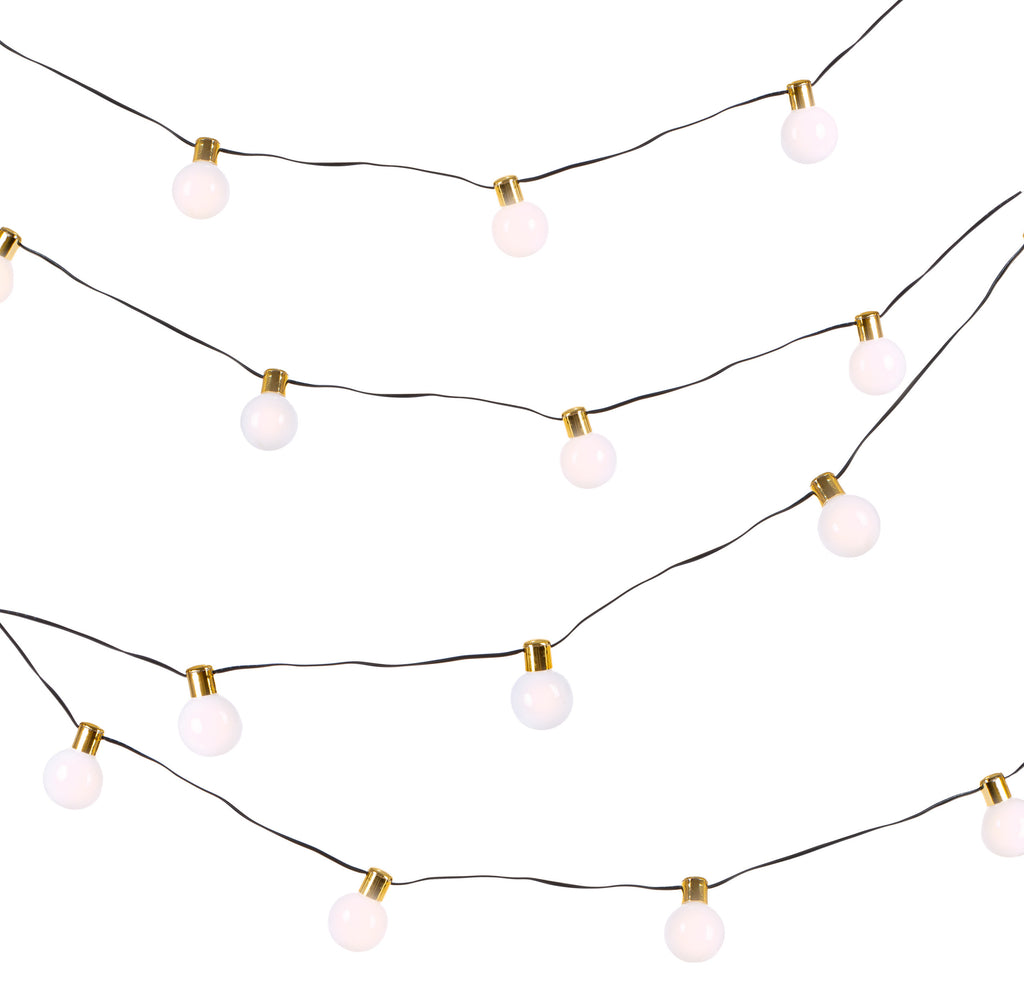 You'll light up the Holiday season with this elegant White Ball and Gold Cap Garland light string set. Each strand includes 30 LED glass bulbs, with a total lighted length of 20 ft. Safely powered 3 AA batteries, not included, this patio light will glow softly and safely all night long and makes this light string the perfect indoor or outdoor accent. Chase away the darkness and add to the warmth of the season with these beautiful and energy efficient light strings.