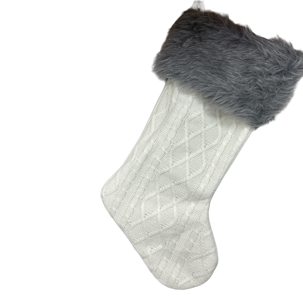 The standout feature is the luxurious grey faux fur cuff, providing a beautiful contrast to the cream knit and adding a soft, inviting texture. Generously sized, this stocking is perfect for filling with an abundance of treats, gifts, and surprises for your loved ones. Hang it on your mantel, stairs, or by the fireplace to create a warm and welcoming holiday atmosphere.