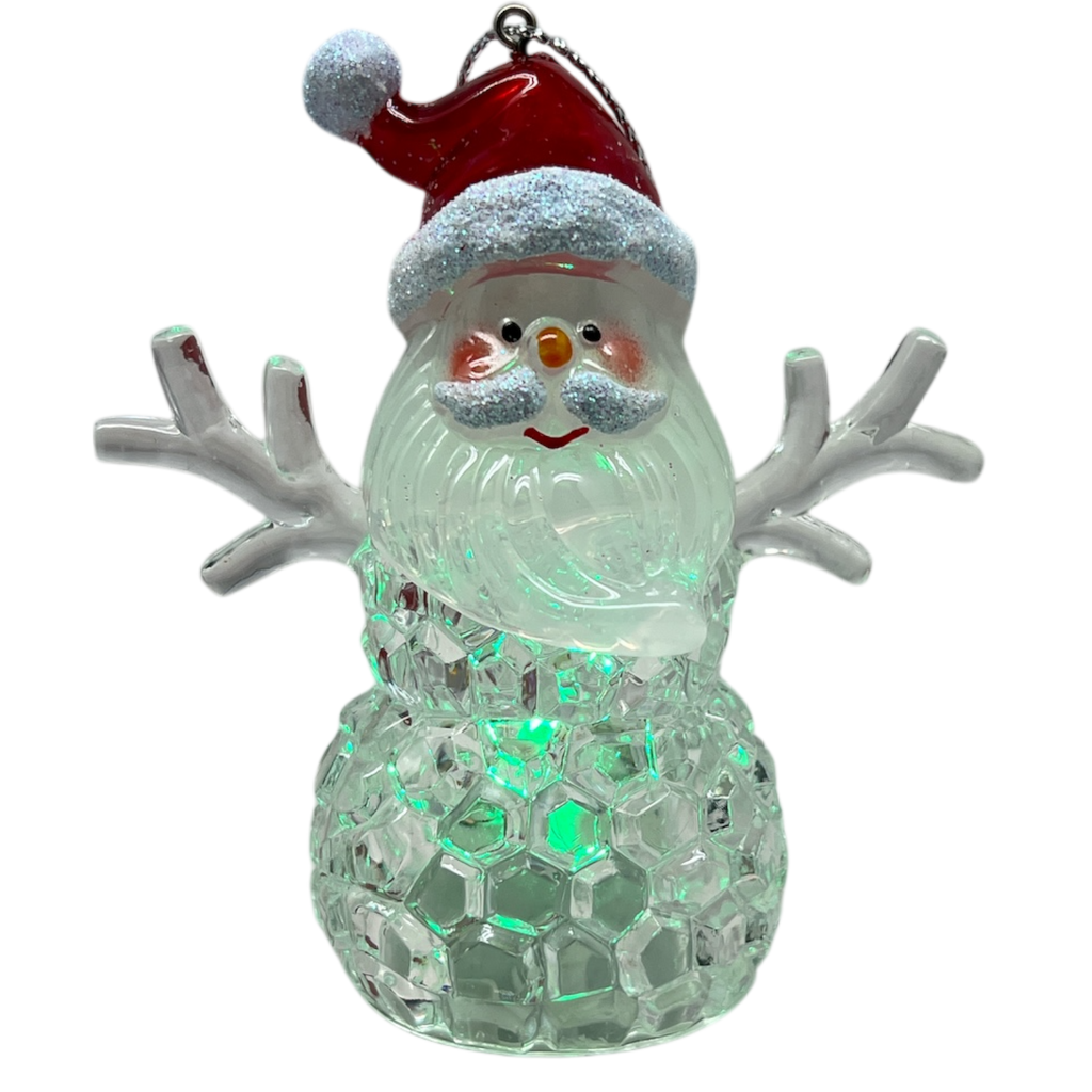 Get ready to add a delightful touch of magic to your holiday decor with the enchanting 3.75" LED Santa Ornament! This adorable ornament features a cheerful Santa Claus, complete with his classic red hat and scarf, exuding festive charm. The unique honeycomb design of the ornament, coupled with LED lighting, creates a warm glow that transitions through a delightful spectrum of changing colors, adding a captivating ambiance to your Christmas tree.