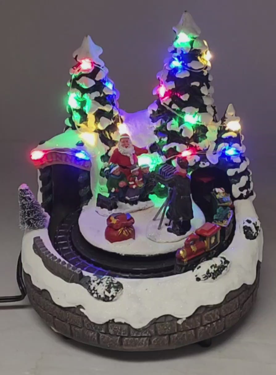 Immerse yourself in the festive spirit with this captivating Lighted Musical Village featuring a heartwarming Santa scene. Standing at 7.5 inches tall, this meticulously crafted decoration captures the magic of Christmas with Santa, cheerful children, and a vintage photographer set against a snowy backdrop of towering evergreens.