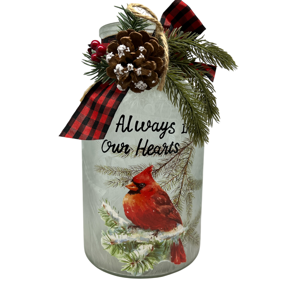 Designed with versatility in mind, this glass jar allows you to add your own fairy lights or a candle (not included) to create a cozy and inviting glow. Perfect for enhancing your home’s ambiance during the holidays, the Holiday Cardinal Glass Jar can serve as a charming centerpiece on a table, a lovely accent on a mantel, or even as a unique decoration on a windowsill. Embrace the spirit of the season and create lasting memories with this delightful luminary that brings warmth and cheer to your home!