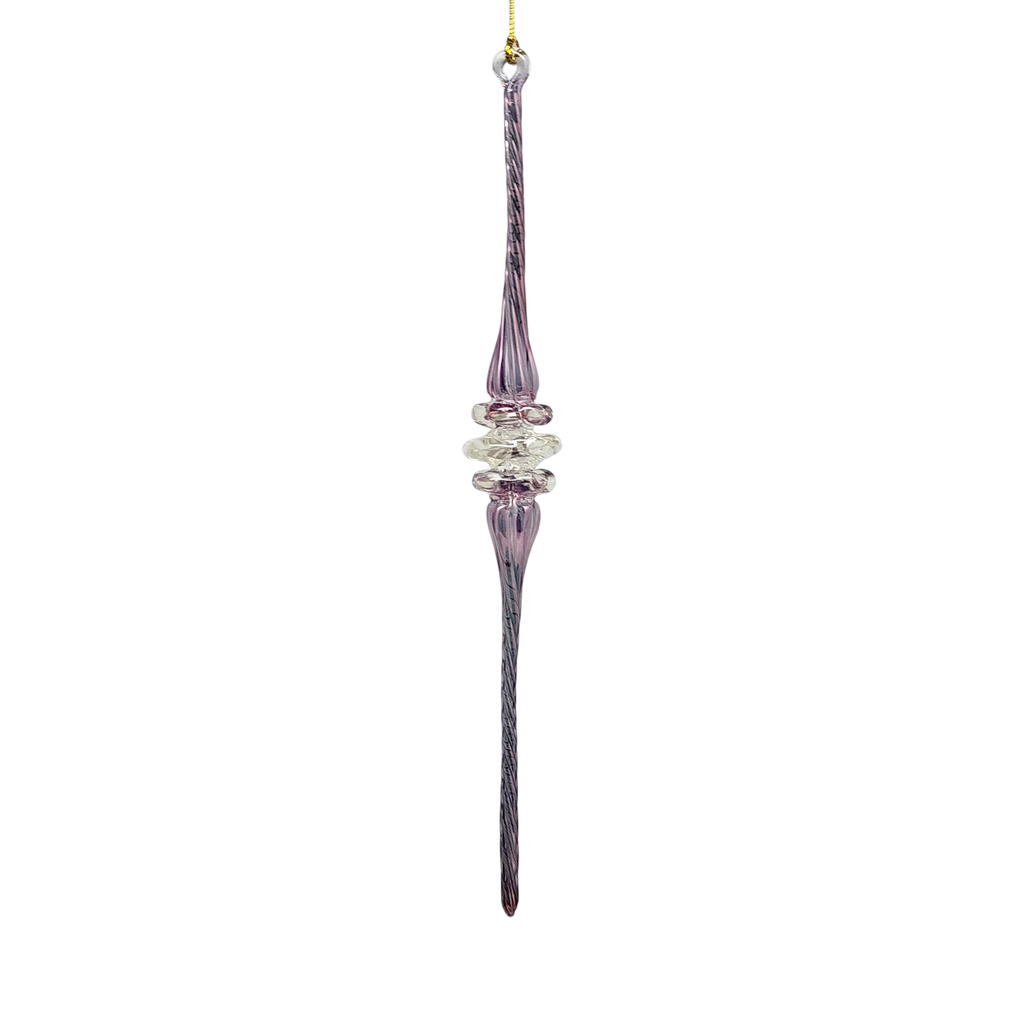 This exquisite ornament combines a slender, icicle-inspired silhouette with a playful spiral of clear glass at its center, creating a dazzling focal point on any festive bough. Handcrafted from mouthblown German Pyrex glass in Egypt, the soft amethyst hue is painted into the intricate, elongated form and then baked in a specialized oven—locking in its vibrant color for years of holiday sparkle. The clear spiral collar adds depth and light refraction, making it look like a frosty swirl of ice caught in motion.