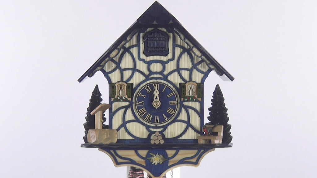 Introducing the Modern Blue Black Forest Cuckoo Clock—a delightful blend of contemporary style and traditional craftsmanship! This stunning clock features a classic half-timbered house design, but with a vibrant modern blue color that breathes new life into the tried-and-true aesthetics of the Black Forest. The hand-carved roof and charming fir trees surrounding a quaint water trough beautifully encapsulate the spirit of the forest while offering a chic twist on a beloved classic. Each hour and half hour, the cheerful cuckoo calls, making it a whimsical addition to your home décor that will surely become a conversation starter.
