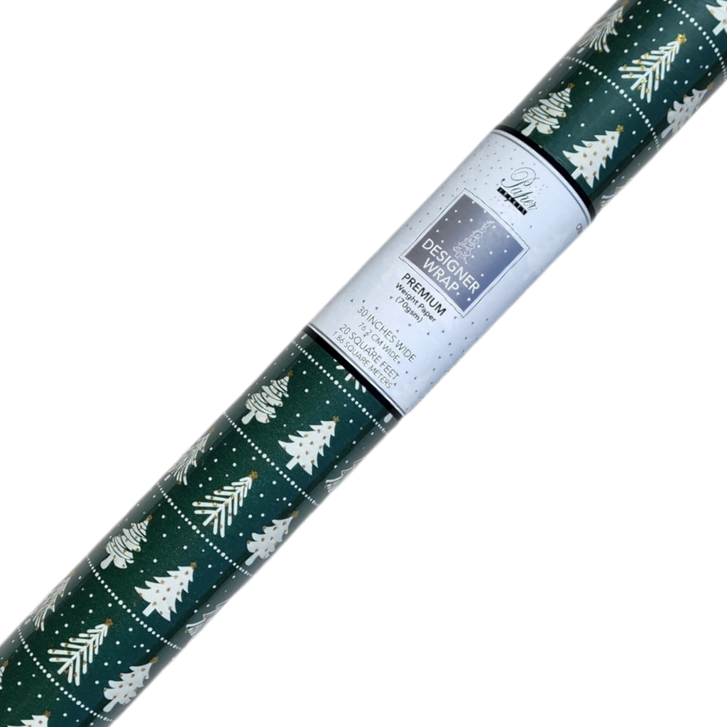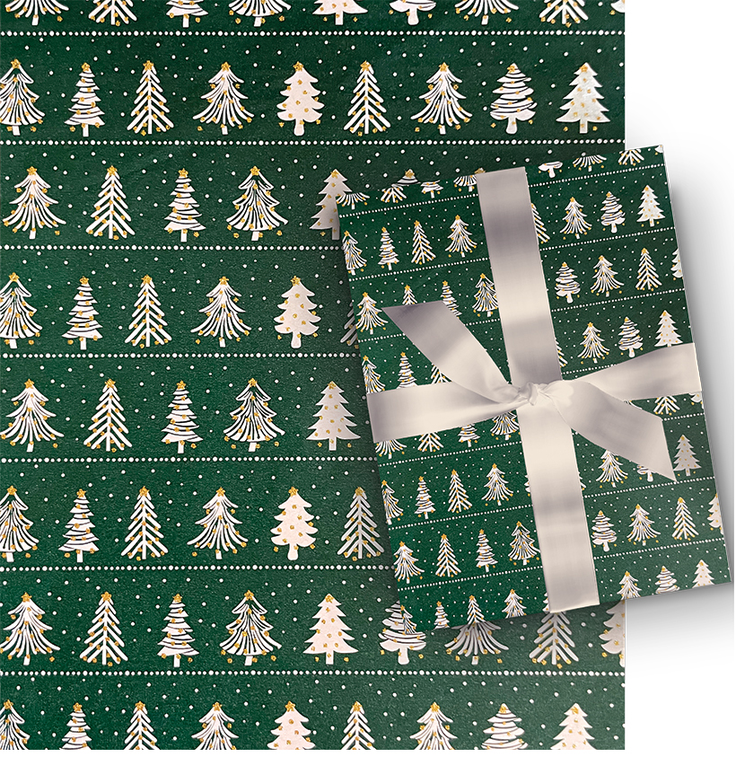 Wrap your gifts in the serene beauty of a winter forest with Evergreen Enchantment Gift Wrap. This premium designer wrap features a dazzling display of elegantly decorated Christmas trees sprinkled with snowflakes against a deep, rich green backdrop, invoking the timeless charm of holiday traditions. At 30 inches wide and 96 inches long, this wrapping paper provides ample coverage, allowing you to wrap gifts of various sizes with a touch of festive magic.