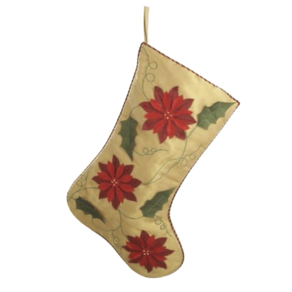 Measuring 17 inches in length this spacious stocking is perfect for holding gifts treats or holiday surprises for your loved ones. Its beautiful design enhances the festive atmosphere in your home whether hung by the fireplace on a wall or on a decorative stand. Celebrate the joy of giving and the beauty of the season with the Appliqué Gold Stocking with Poinsettia a lovely addition to your holiday traditions that will be cherished for years to come!