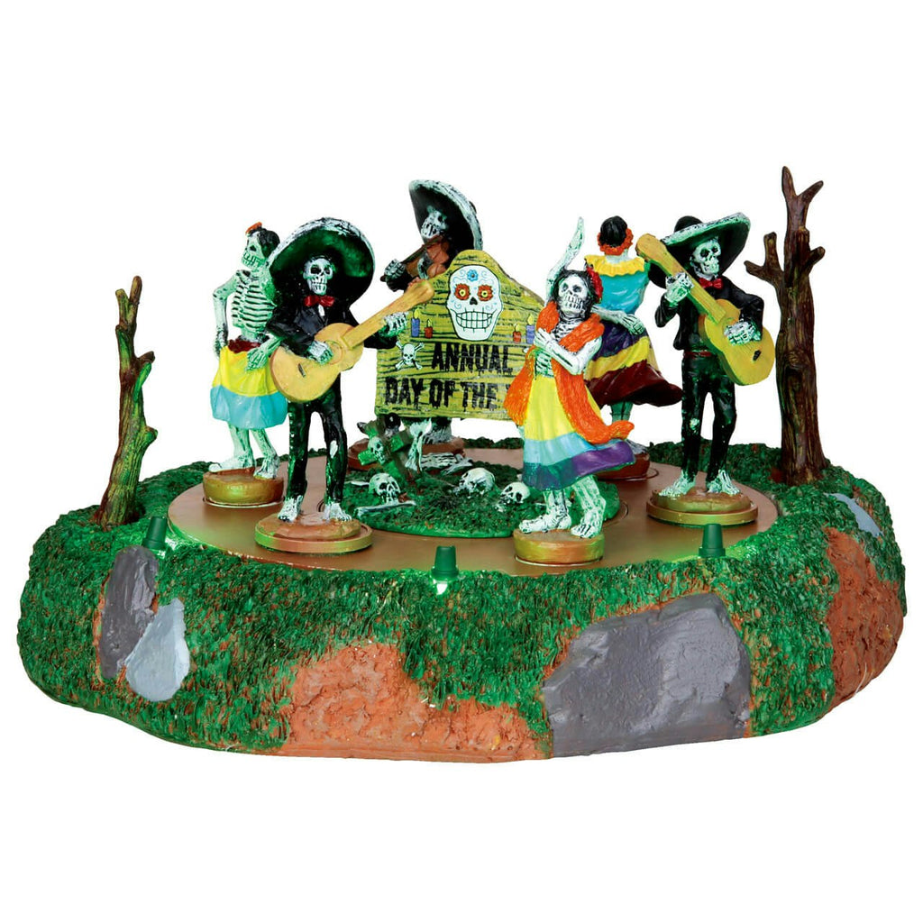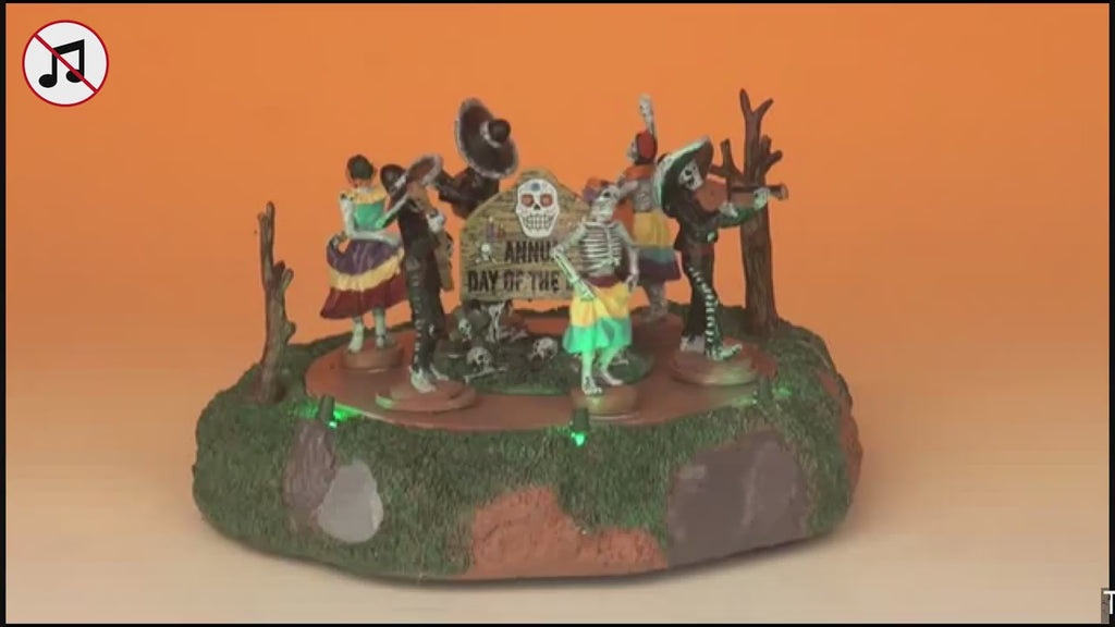 Celebrate Dia de los Muertos in your village display with this vibrant and festive Day of the Dead scene. This captivating piece brings the lively spirit of the holiday to life, complete with twirling dancers, moving musicians, and colorful decorations.