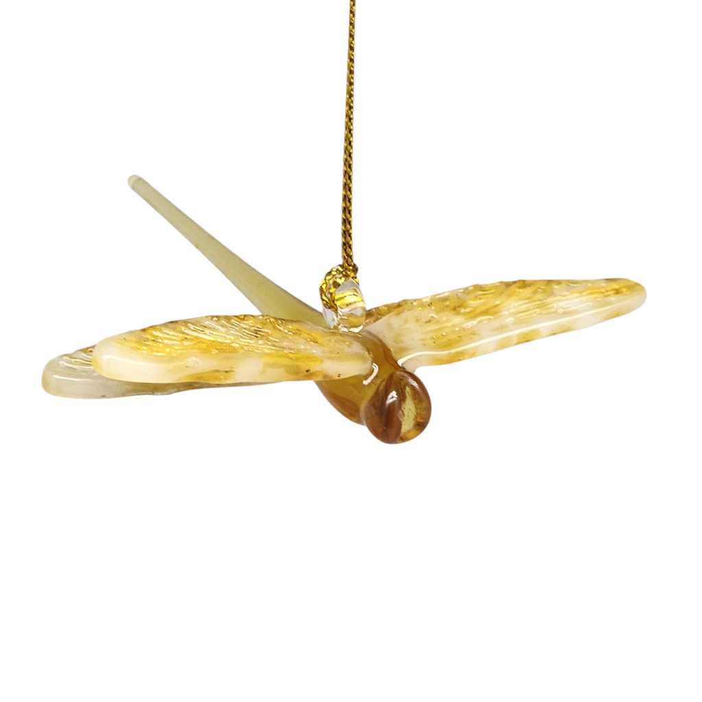 Celebrate the beauty of nature’s golden hour with this graceful mouthblown glass dragonfly ornament. Handmade in Egypt from German Pyrex glass, this piece captures the warm glow of sunlight with its translucent amber tones and delicately textured wings. The subtle golden hues evoke a sense of peace and warmth, perfect for adding a natural, luminous touch to your holiday decorations or everyday décor. The elongated body and finely detailed wings give the ornament a lifelike elegance that draws the eye and brightens any space.