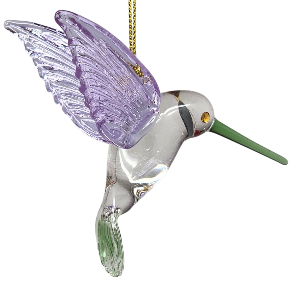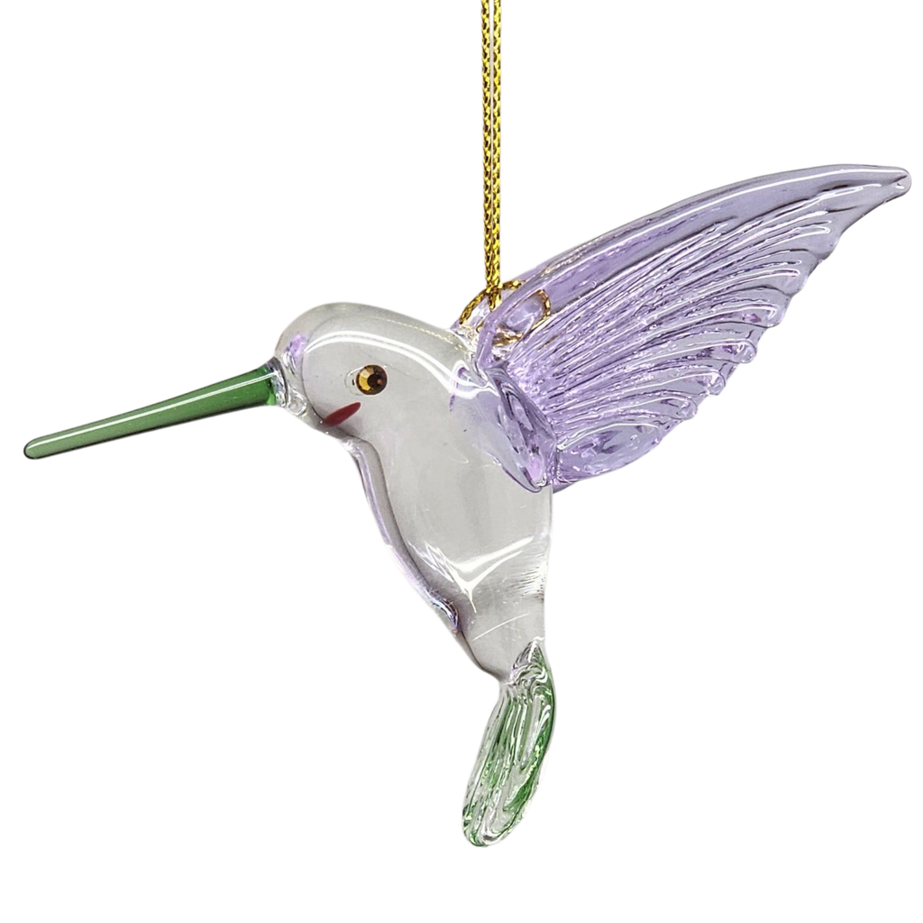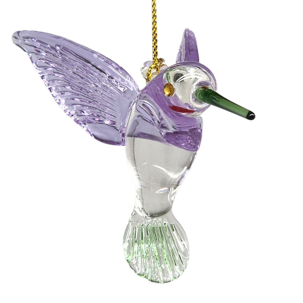 This delicate hummingbird ornament is a shimmering tribute to nature’s most agile flyer. Mouthblown from German Pyrex glass by skilled artisans in Egypt, it features translucent lilac wings that seem to flutter above its crystal-clear body. A slender green beak and a subtle red cheek accent add little bursts of color, while sparkling crystal eyes give the bird a lively gleam. Each piece is hand-painted and oven-baked to seal in its soft pastel hues, ensuring the ornament’s charm endures through many holiday seasons.