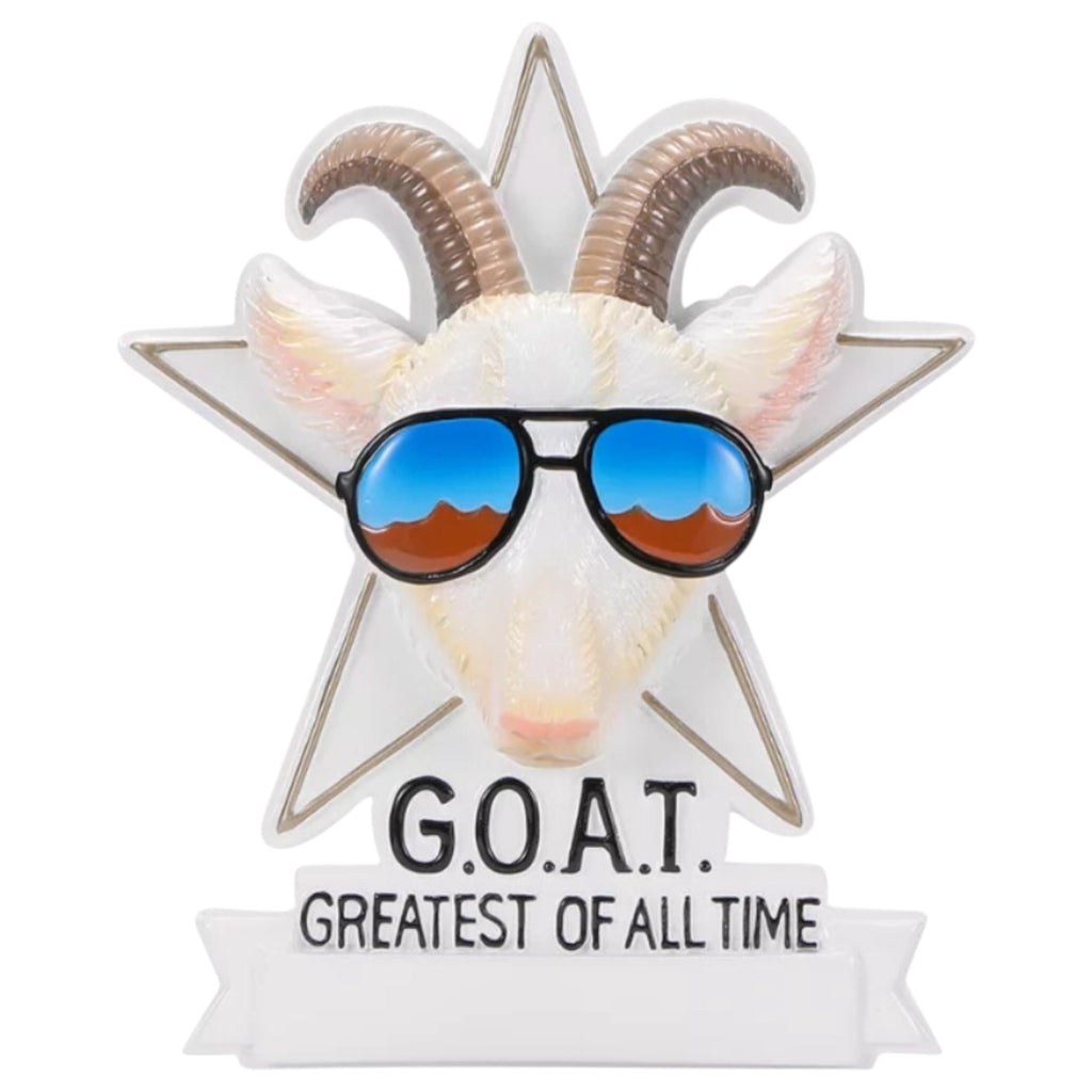 Celebrate your favorite champion or simply embrace the fun with the playful G.O.A.T. (Greatest of All Time) Ornament! This unique ornament features a whimsical goat's head adorned with stylish sunglasses, set against a star-shaped background that shines with festive flair. Crafted from durable resin, it measures approximately 4 inches tall by 3 inches wide, making it an eye-catching addition to your holiday tree or a fun gift for sports fans and goat lovers alike.