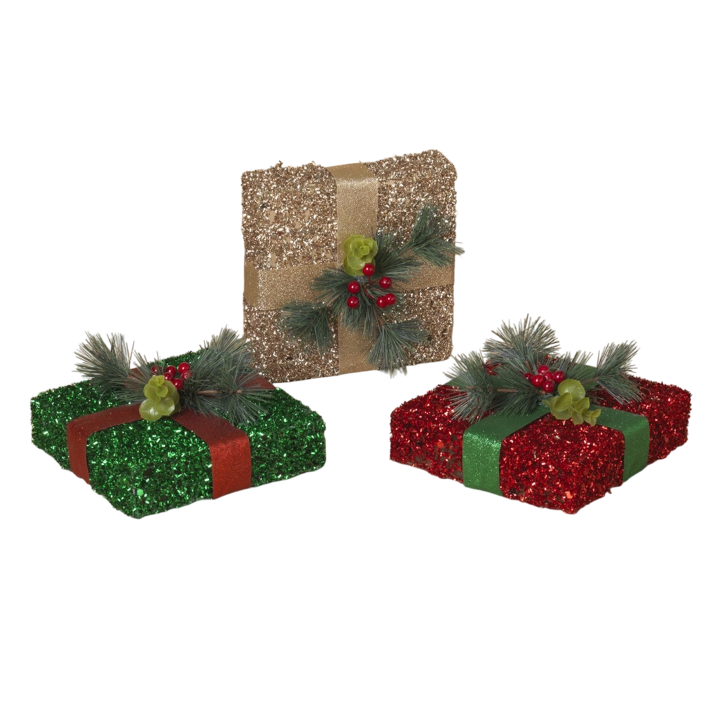 Elevate your holiday décor with our Glittering Holiday Gift Decorations, a delightful trio of faux gift boxes that encapsulate the cheer and sparkle of the season! Each box measures 8 inches by 8 inches and is adorned with shimmering glitter and festive foliage, showcasing vibrant colors that include classic green, rich red, and elegant gold. Topped with beautifully crafted embellishments, each box makes for a brilliant centerpiece or decorative accent that captures the spirit of gift-giving.