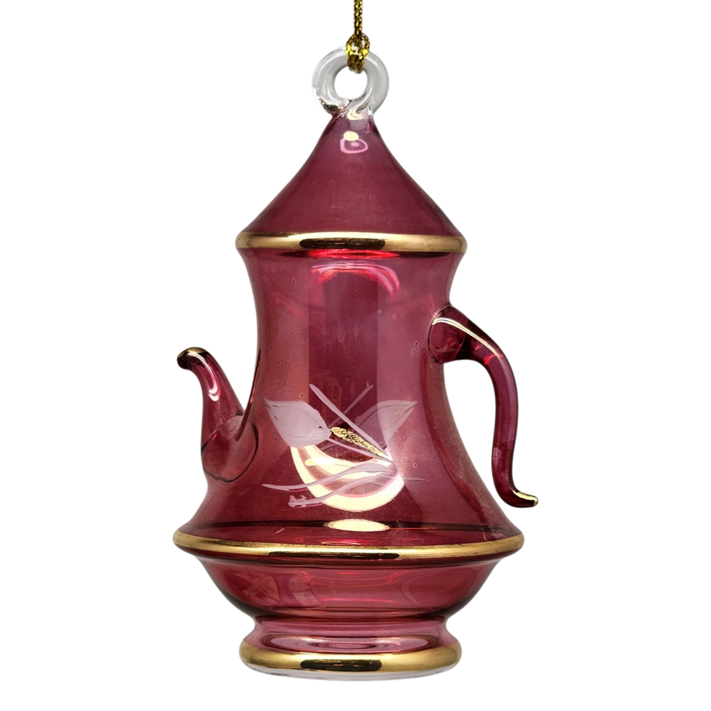 Elevate your holiday decor with the enchanting Glass Collectible Arabian Coffee Pot Ornament! Handmade with love and expertise in Egypt, this stunning piece stands 4.5 inches tall and showcases the artistry of mouth-blown glass. Adorned with a unique engraved design and accented with real 24K gold, the rich colors and intricate details transform this ornament into a captivating conversation starter.
