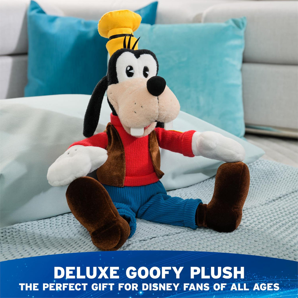 - DELUXE GOOFY PLUSH: This soft 14` plush features Disney`s Goofy dressed in deluxe fabrics: blue corduroy pants, a red knitted turtleneck sweater, a velvety brown vest, and matching shoes. He also has long, floppy ears and a yellow hat with black satin lin