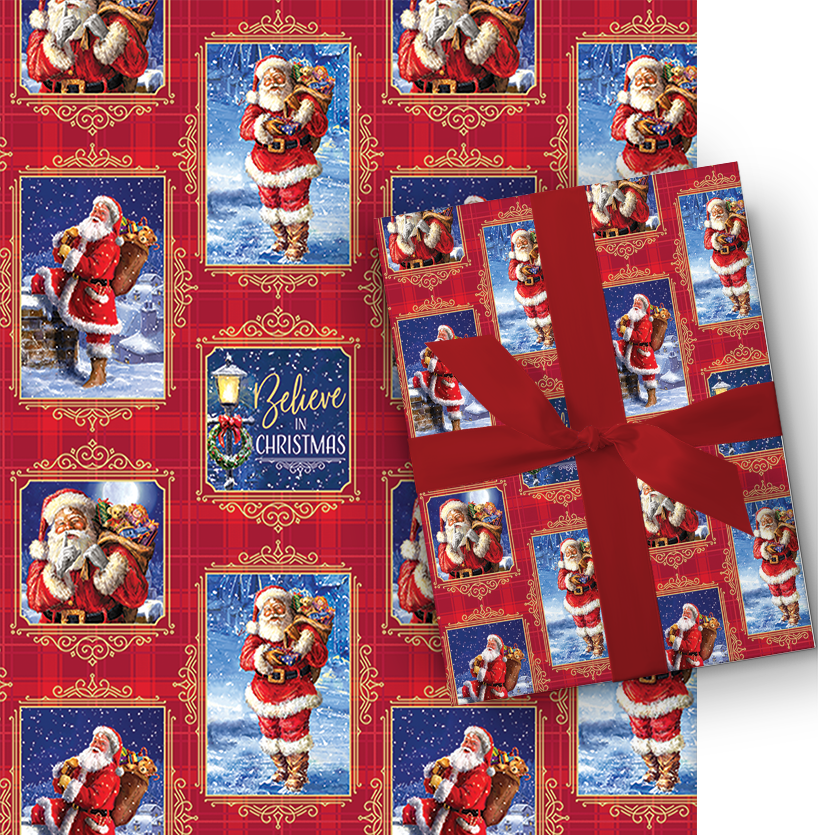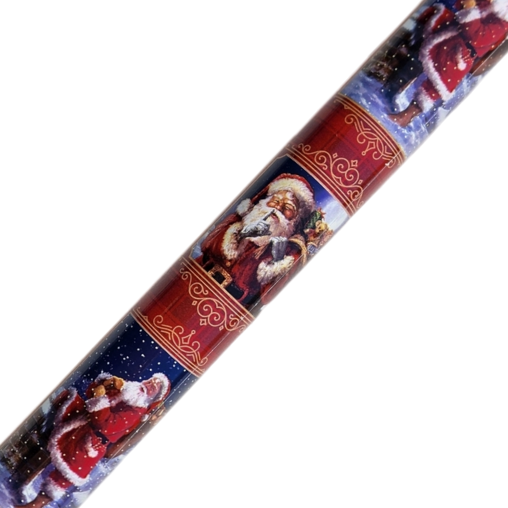 Celebrate the magic of Christmas Eve with the enchanting Classic Santa's Night Gift Wrap. This premium wrapping paper features nostalgic illustrations of Santa Claus in his iconic red suit, depicted amid snow-covered scenes and framed by elegant golden scrollwork against a rich, deep blue and red backdrop. Measuring 30 inches wide and an impressive 168 inches long, this generous roll of wrapping paper ensures that you have plenty of material to wrap presents of all sizes, making them as delightful to look at as they are to open.
