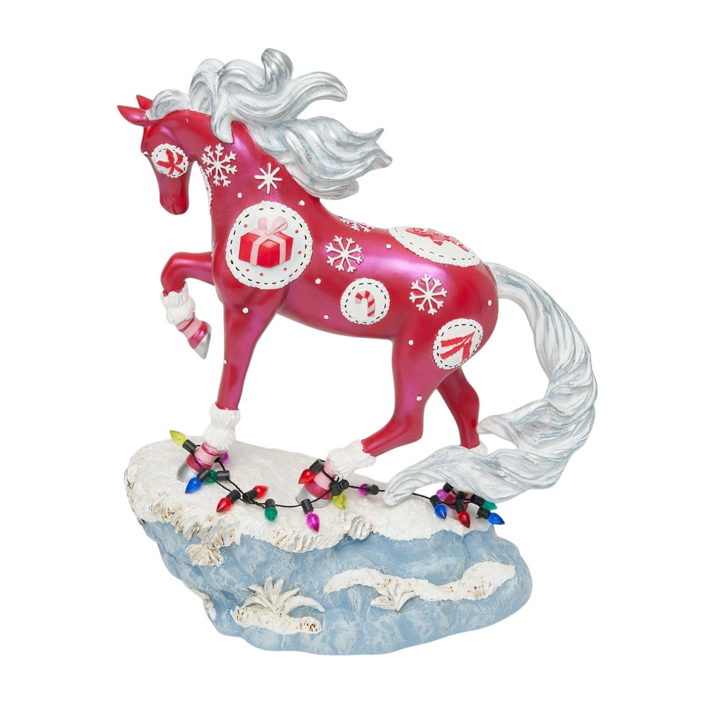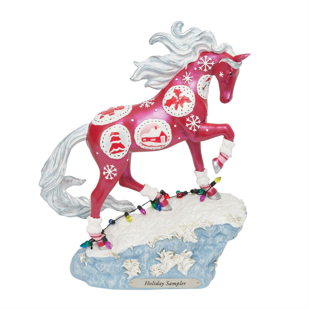 Embrace the festive spirit with the captivating figurine from the Trail of Painted Ponies Collection titled "Holiday Sampler." Standing at 9 inches tall, this vibrant piece features a striking pink horse adorned with whimsical holiday motifs, including cheerful symbols that embody the joy and warmth of the season. The horse’s dynamic pose, prancing atop a snowy base decorated with colorful lights, perfectly captures the excitement and celebration of Christmas.