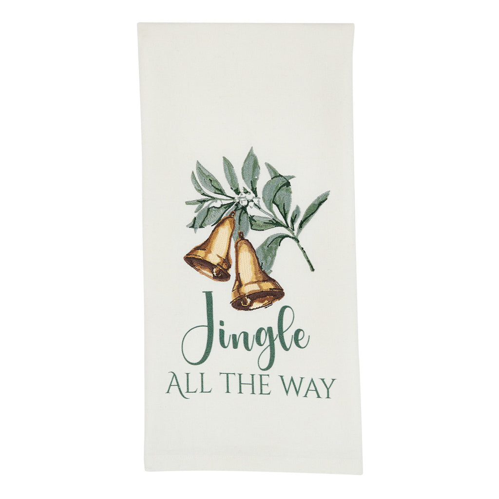 Capture the festive spirit with this beautifully embroidered cotton towel, perfectly designed to usher in the holiday season. Measuring 18" x 26", this elegant towel features delicate embroidery of two golden bells adorned with green leaves, hanging gracefully above the cheerful phrase “Jingle All The Way.” The soft, durable fabric makes it an ideal addition to your kitchen or bathroom, adding a touch of charm and seasonal joy to your home decor.