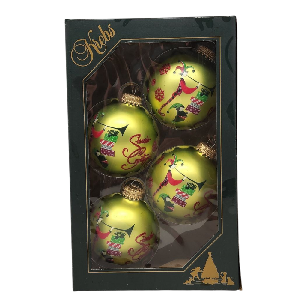 Bring a playful spirit to your holiday décor with our delightful set of four vibrant green glass ball ornaments! Each ornament, measuring just over 2.5 inches in diameter, features whimsical designs that celebrate the joy of the season, including cheerful holiday characters and festive gifts. The bright green backdrop combined with lively images is sure to add a pop of color and fun to your Christmas tree or holiday displays.