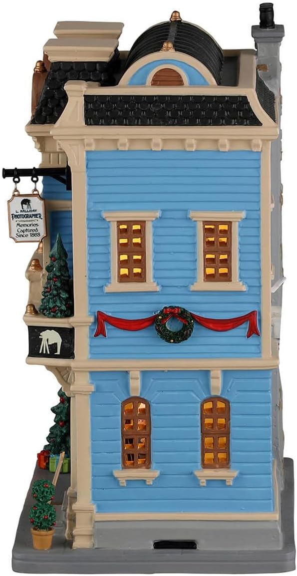 Capture the magic of the season with the charming L. Halliday Photography Studio, a highlight piece for your holiday village collection! This beautifully detailed Victorian-style building, draped in festive decorations, offers a delightful invitation to create lasting memories with family. Standing at approximately 8.9 inches high by 6.6 inches wide and 4.6 inches deep, this porcelain piece lights up warmly, adding elegance and a nostalgic ambiance to your holiday display.