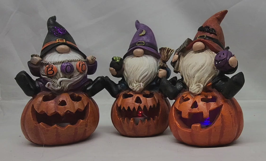 Hand-painted polyresin gnomes sitting atop a Jack-o-Lantern. Withing the jack-o-lantern's mouth is a color changing LED light.