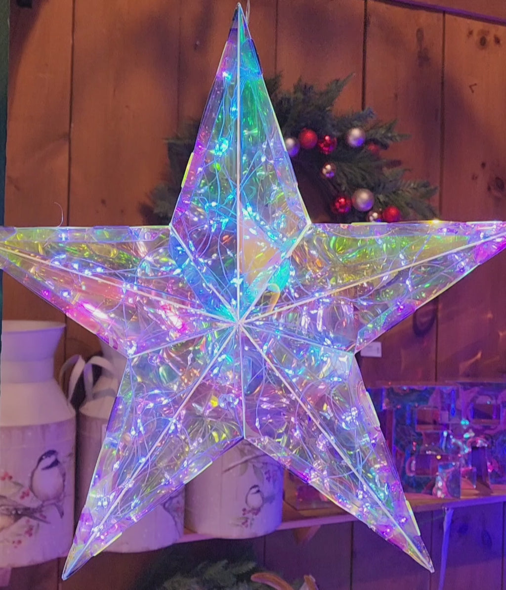Illuminate your holiday celebrations with our stunning 15-inch lighted holographic star, a dazzling centerpiece that captures the essence of the season. This enchanting star features a mesmerizing holographic finish that reflects light beautifully, creating a magical display wherever it is placed. With multiple lighting options and 8 distinct functions, you can easily set the perfect ambiance for your holiday gatherings, from twinkling to steady glow.