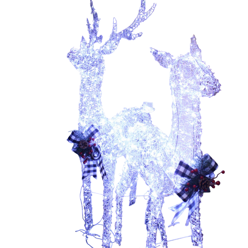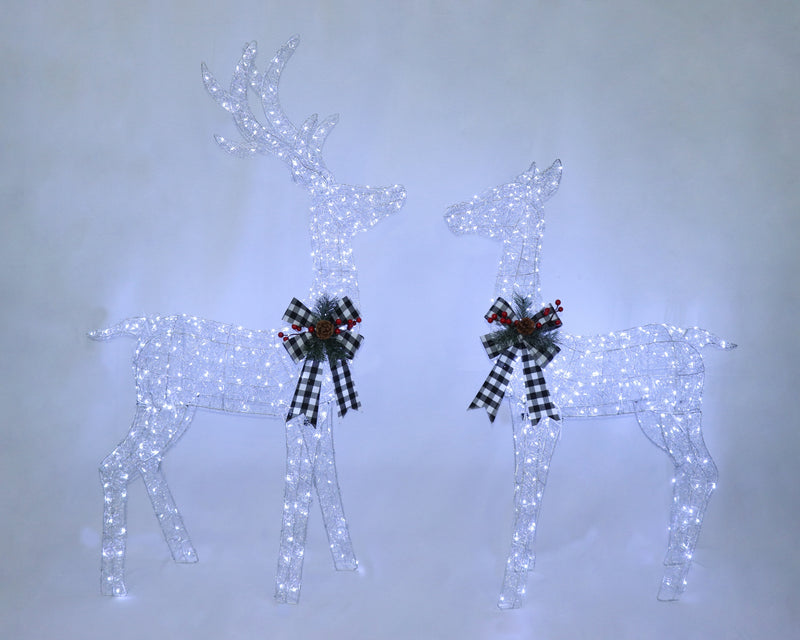 Wire-frame reindeer couple with 660 Cool White LED lights from Antler to tail to Hoof, and accented with a festive bow.  Made to be plugged in together, they will light the way in a style that Rudolph could only hope to match.