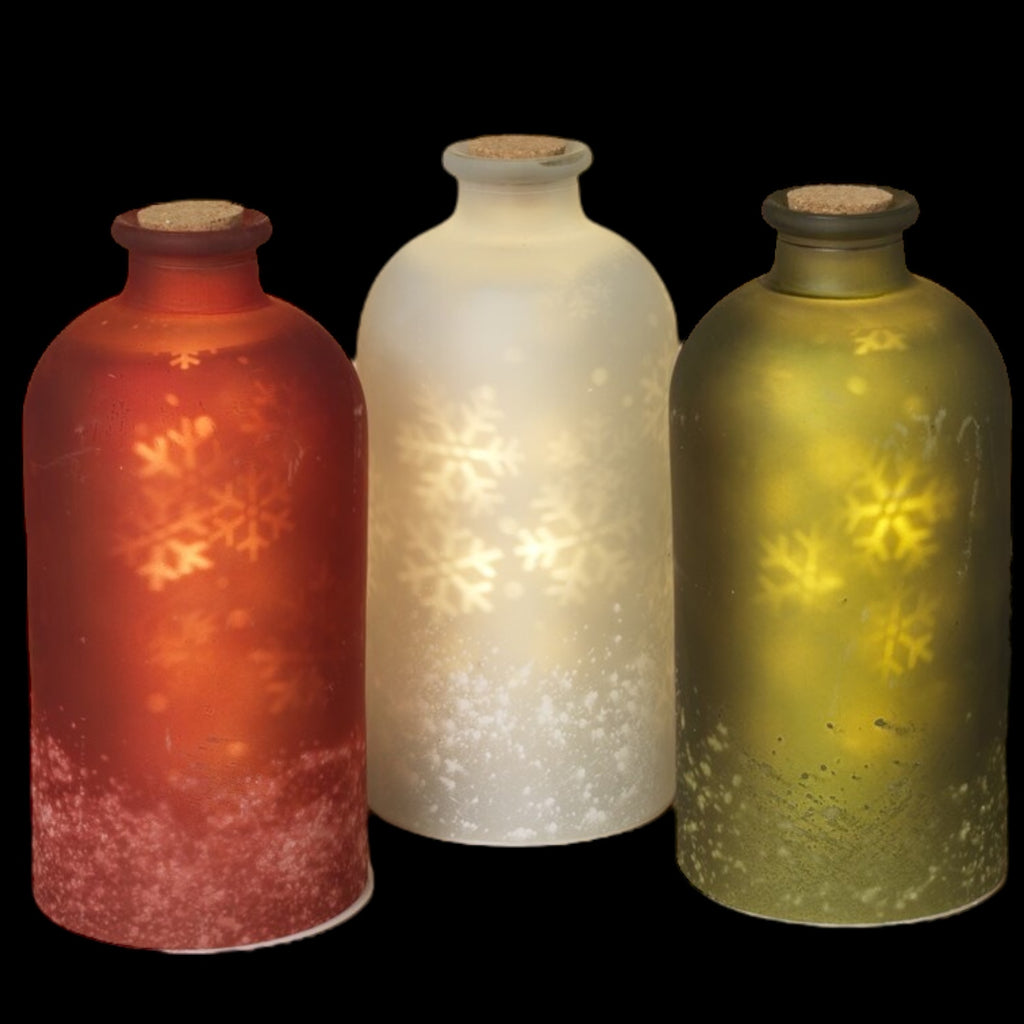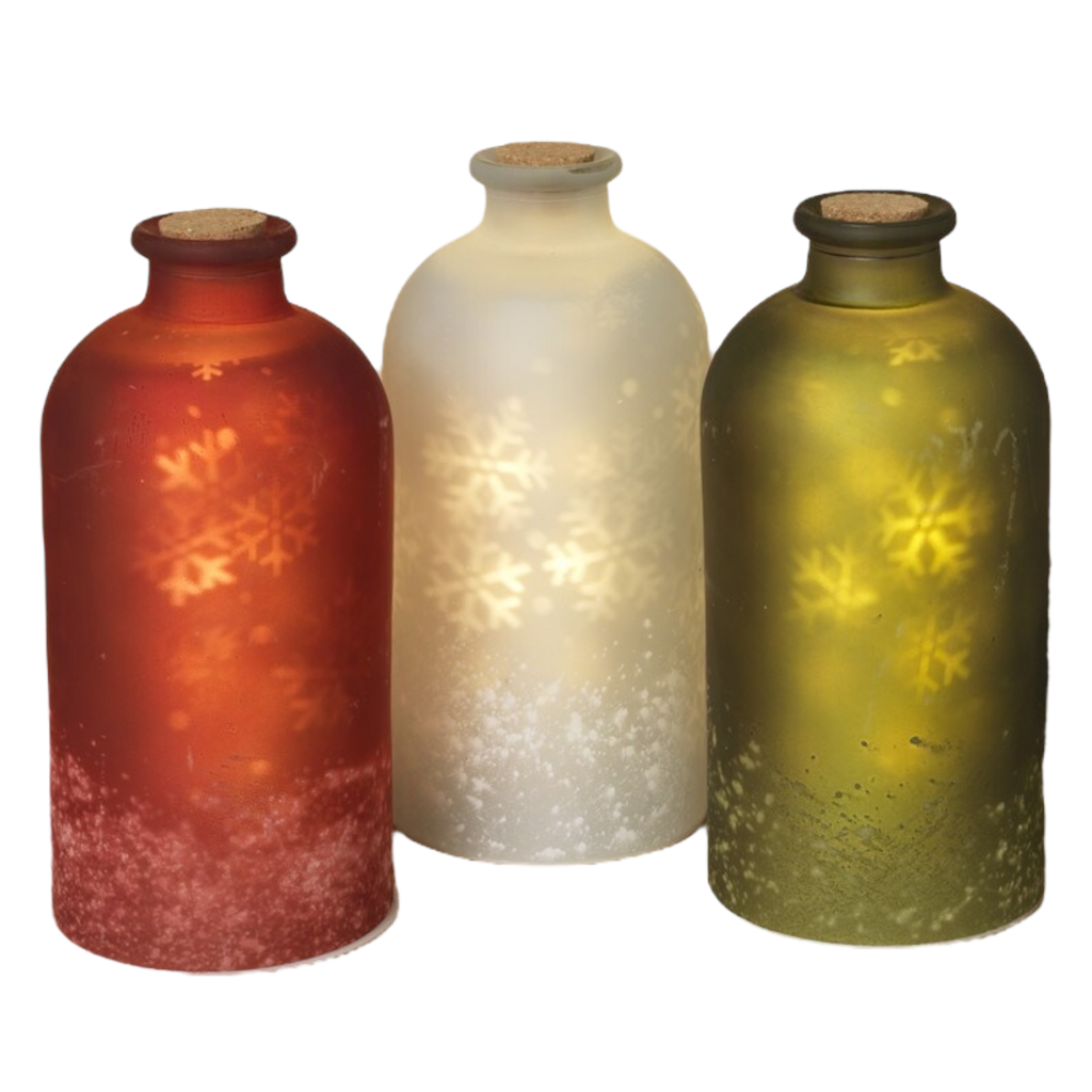 Illuminate your holiday décor with our enchanting Lighted Snowflake Luminary Bottles! Standing at 9.5 inches tall, each bottle features a beautiful frosted glass design that perfectly captures the essence of winter. Available in vibrant colors of festive red, soft white, and rich green, these lovely luminaries are designed to create a magical ambiance in your home.