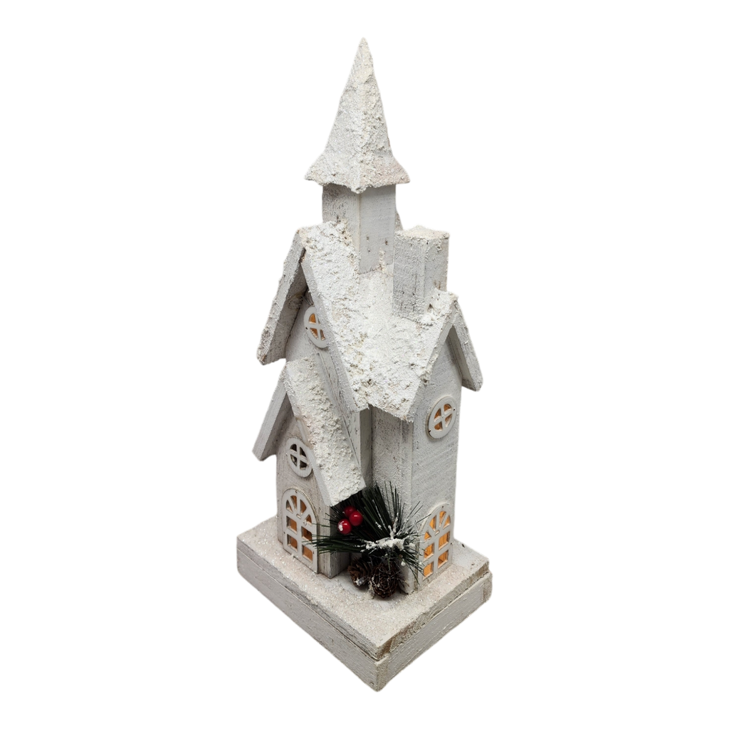 Create a magical winter wonderland with this rustic lighted white wood church. Trimmed with snowy accents, greens, and berries, it's the perfect addition to your holiday decorations. Measuring 15.5 inches tall, it's sure to bring a touch of festive cheer to your home!