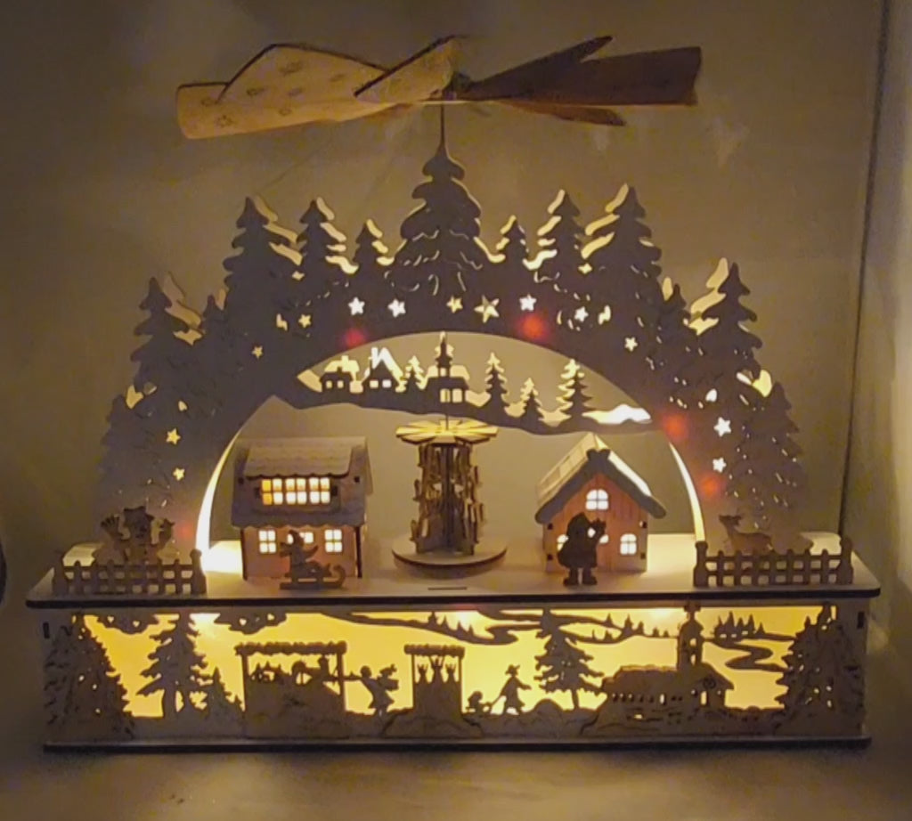 Bring warmth and charm to your holiday decor with this enchanting wooden tabletop scene! Designed with meticulous detail, this delightful piece features a magical winter landscape complete with intricately crafted houses, trees, and a charming windmill. The beautiful design incorporates 10 warm LED lights that create a soft glow, illuminating the scene and adding a cozy atmosphere to your home.