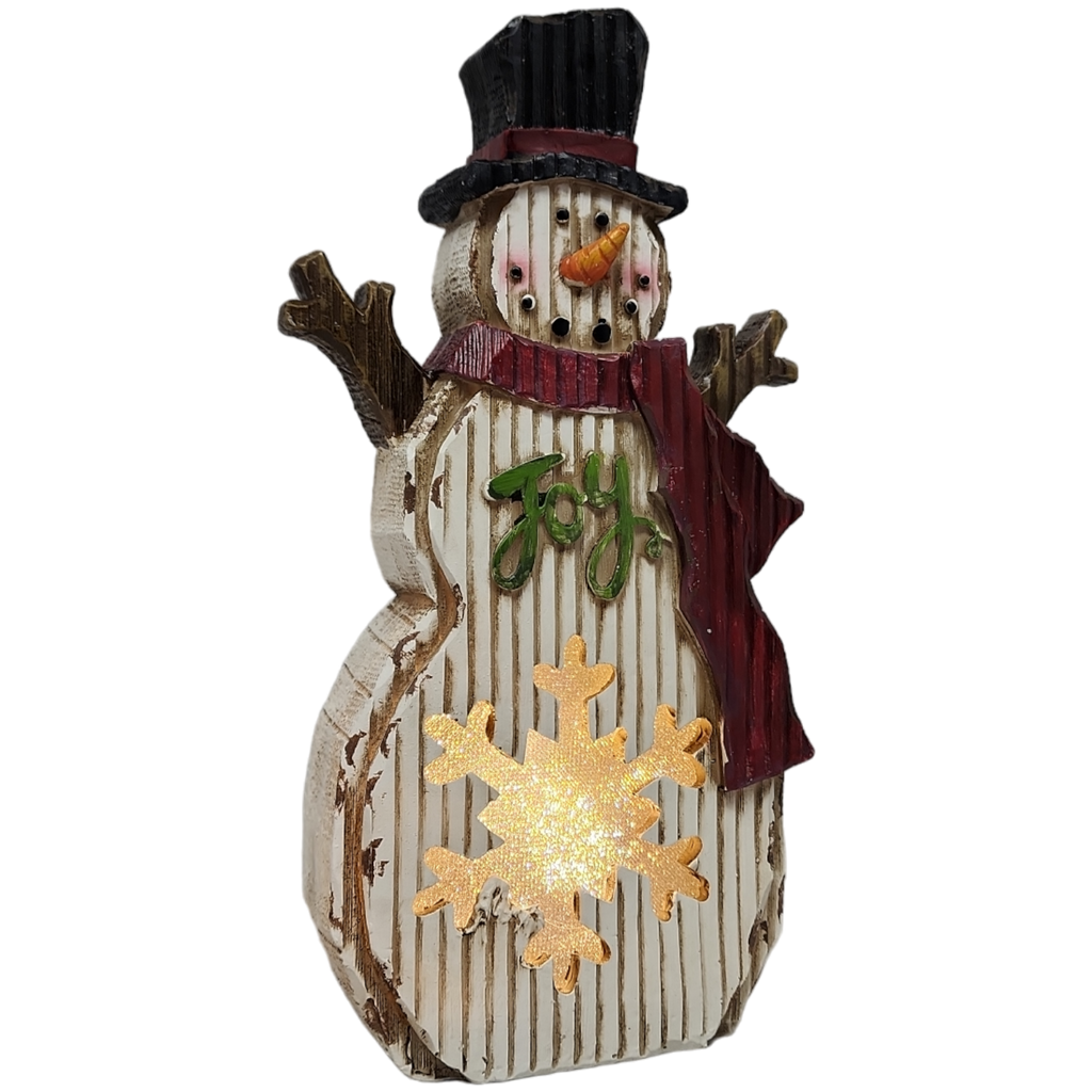 Polyresin rustic styled Snowman with a lightup Snowflake in his belly.