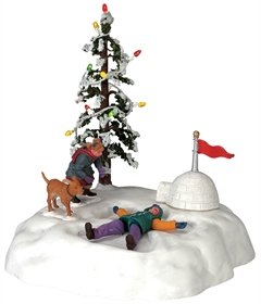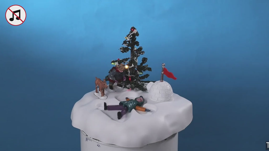 This charming Christmas village scene features a beautifully lit tree adorned with festive lights, adding a warm glow to the winter setting. In the foreground, a character is delightfully making a snow angel, moving its arms and legs to create the familiar pattern in the snow. Nearby, another figure stands clad in cozy winter clothing, accompanied by a small deer. Adding to the whimsical atmosphere, an igloo with a red flag perched on top sits to the side, completing this enchanting winter wonderland.