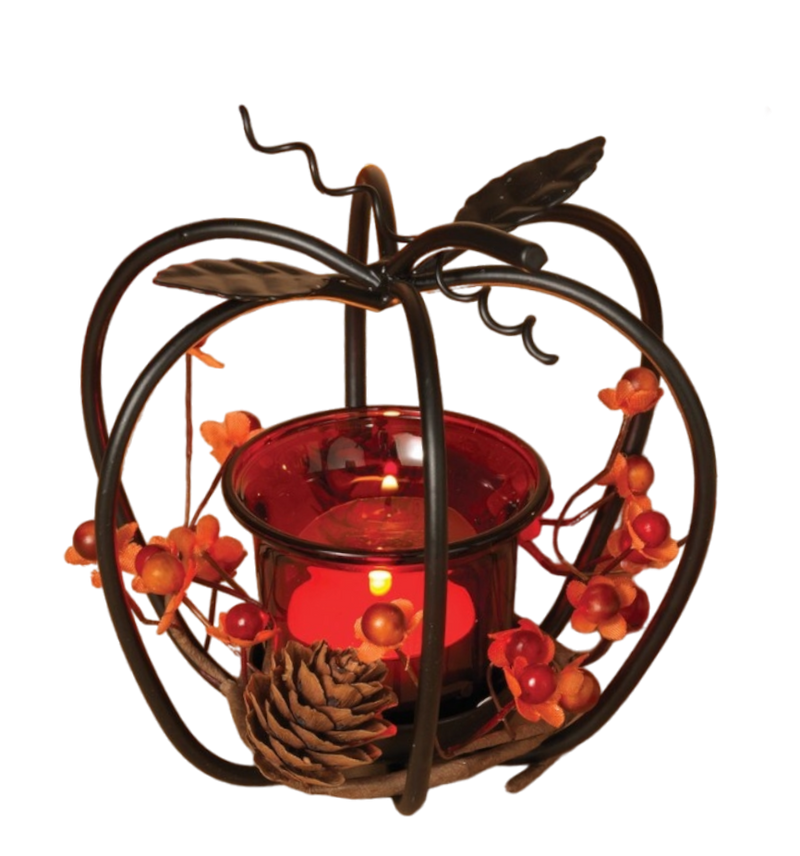 This charming candle holder is shaped like an apple, offering a delightful twist on seasonal decor. Measuring 4 inches in length, 5 inches in width, and 5.7 inches in height, it is an endearing and compact piece perfect for adding a touch of autumn warmth to any setting. The metal framework elegantly forms the shape of an apple, complete with detailed leaves and a curly stem, and is adorned with beautiful orange berries and a pine cone, evoking the essence of harvest time.