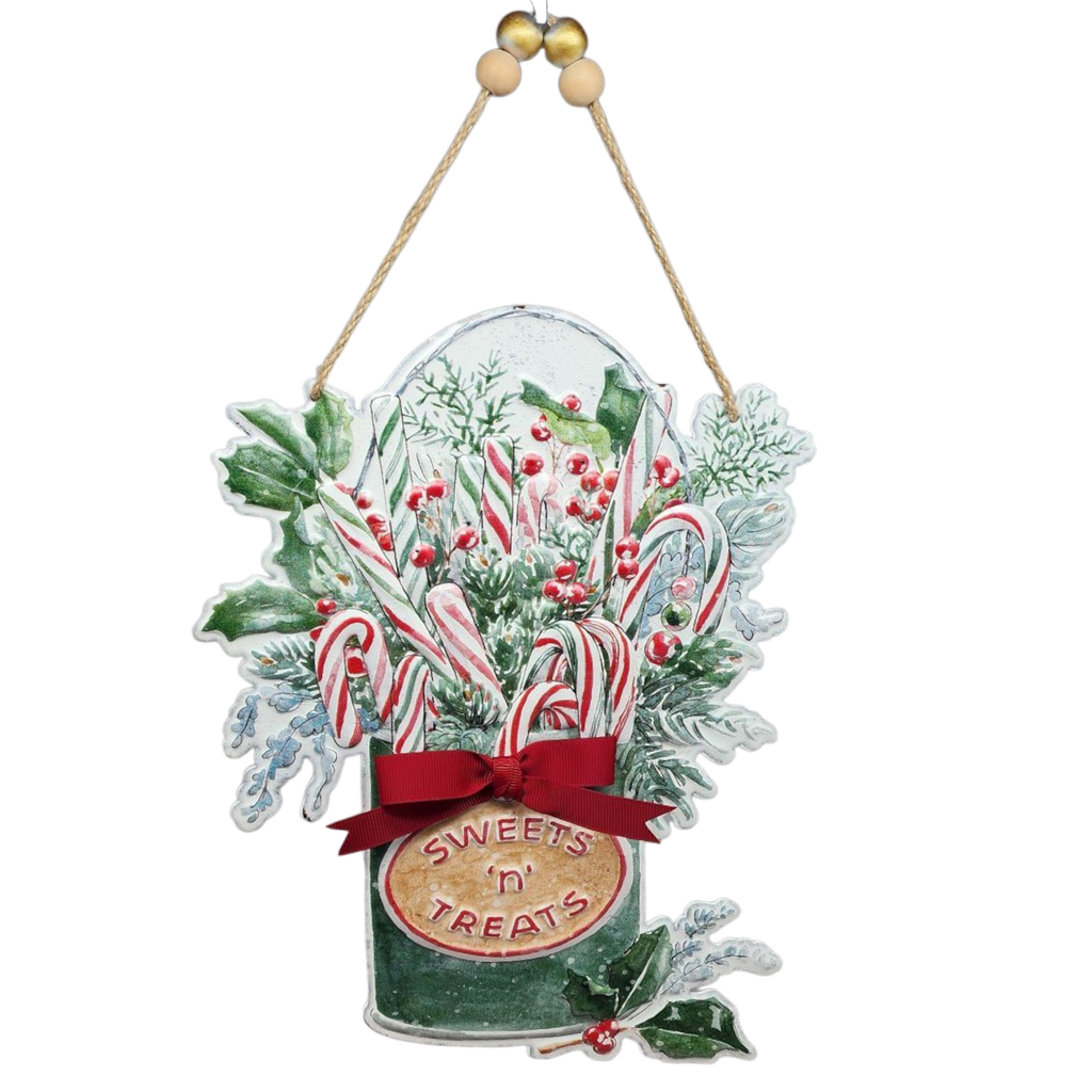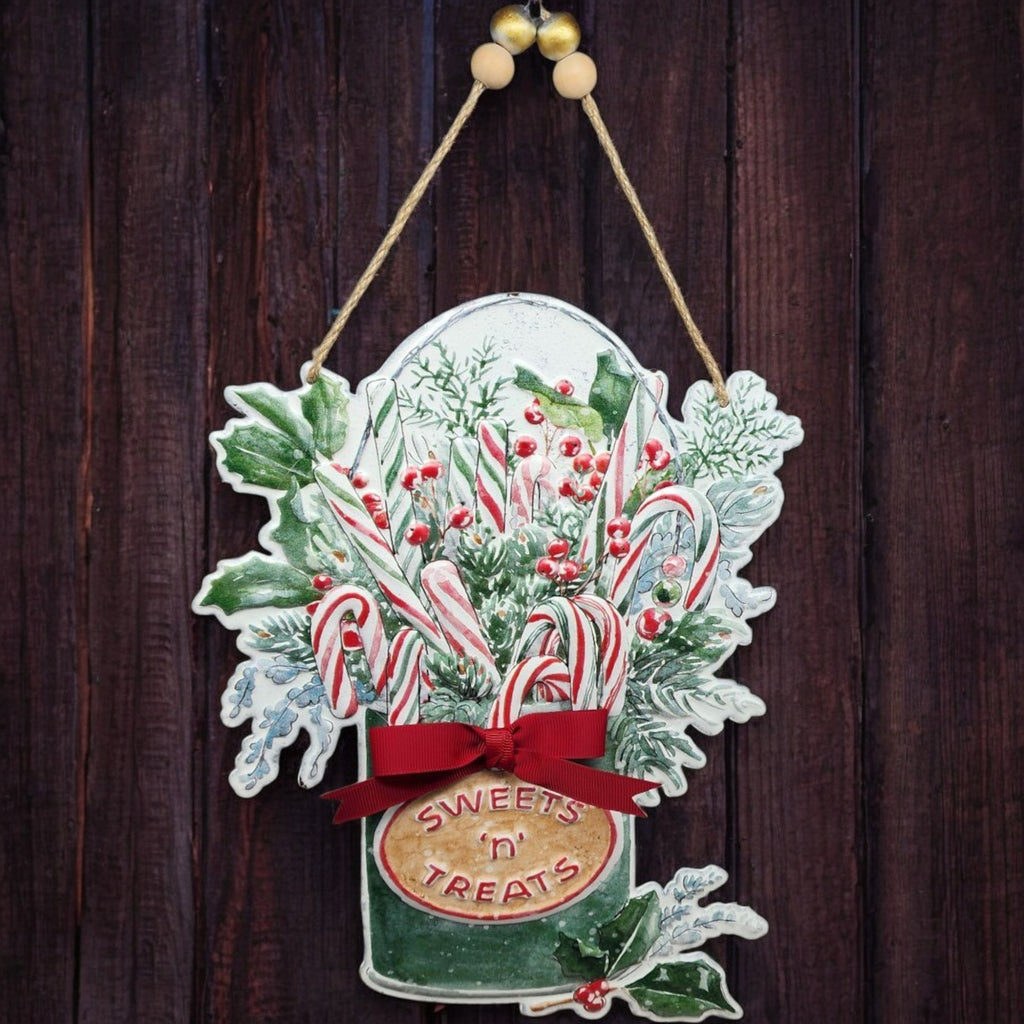 Sweeten your seasonal decor with the delightful Sweets n' Treats Holiday Sign! This charming piece features a beautiful illustration of festive greenery bursting with candy canes and berries, beautifully designed on a durable surface. Measuring 10 inches by 7 inches, it's the perfect size to hang in your kitchen, dining area, or entryway, inviting guests to indulge in the joys of the season. Adorned with a lovely fabric bow and wooden beads, this sign blends rustic charm with festive flair, making it a delightful addition to any holiday setting.