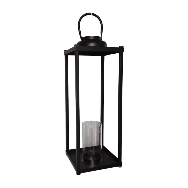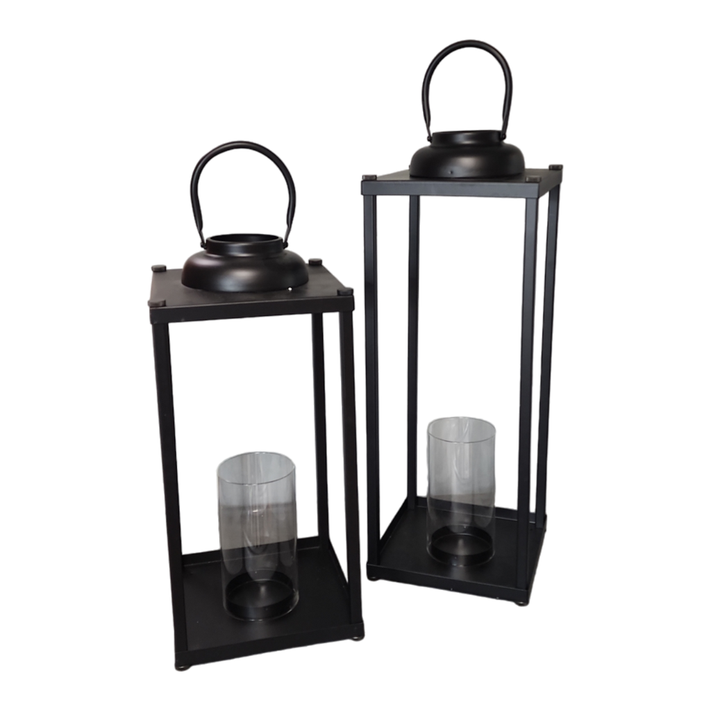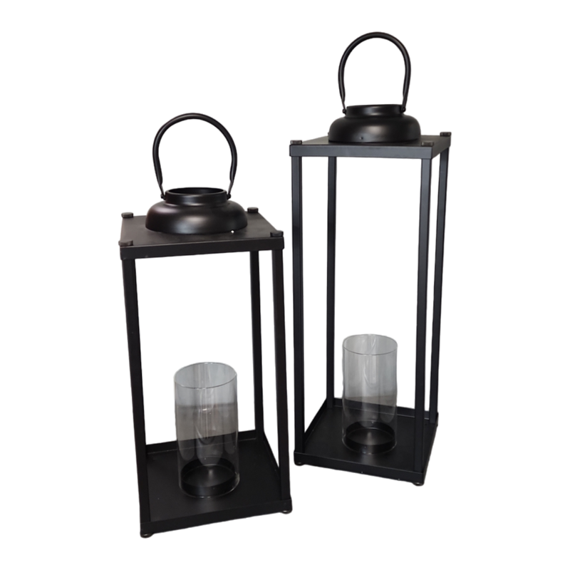 Gorgeous and Sleek, these black iron Candle Lanterns can either sit on a table or be hung from the handle.
