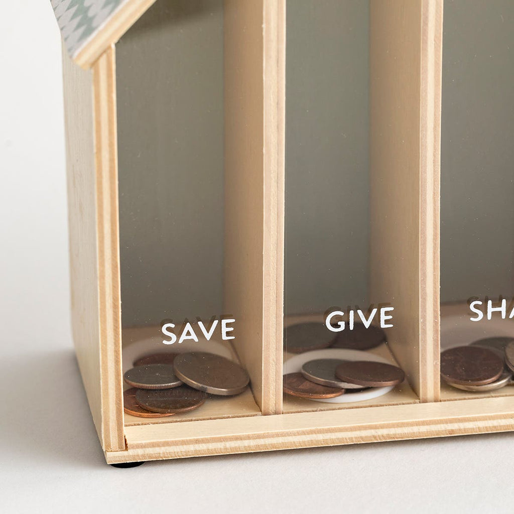 See-through acrylic front allows for child to see their money grow! Money can be taken out from holes on bottom of bank.