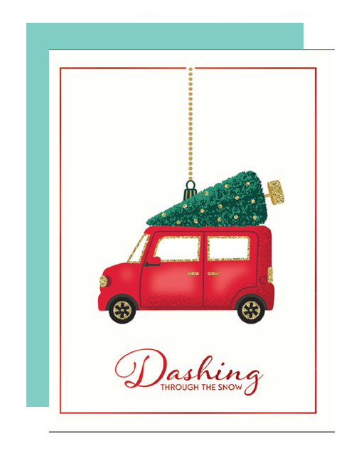 Add a dash of whimsy to your holiday messages with Dashing Through the Snow, a playful design from the Petite Greetings collection. This card features a red car with gold foil wheels and trim, carrying a decorated Christmas tree topped with a golden star. A looped gold string above the car hints at ornament-style charm, while the phrase “Dashing THROUGH THE SNOW” nods to the classic carol. Paired with a teal envelope, it’s a cheerful way to spread seasonal joy.