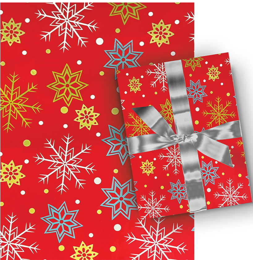 Illuminate your holiday gifts with the vibrant charm of Festive Snowflake Sparkle Gift Wrap. This premium wrapping paper features an array of beautiful snowflakes in striking colors of white, blue, and gold, scattered across a bold, cheerful red background. Measuring 30 inches wide and 120 inches long, this generous roll provides plenty of material to wrap gifts of all shapes and sizes, ensuring they shine with festive brilliance.