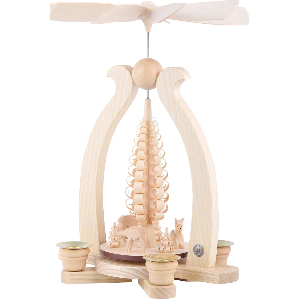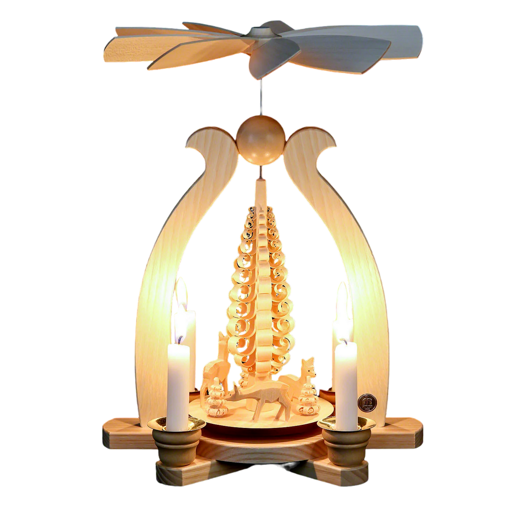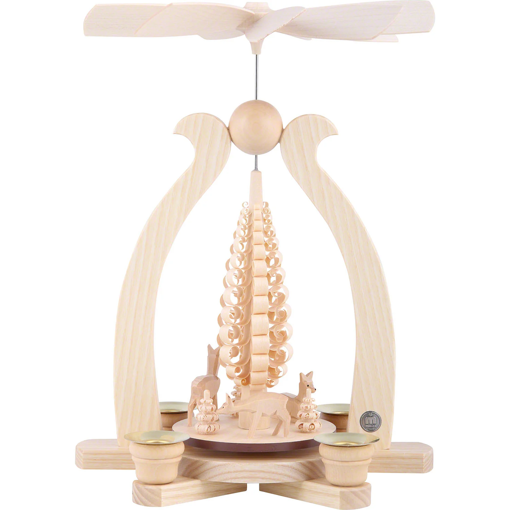 Beautiful handcrafted pyramids from Mueller, in the Erzgebirge region of German. The warmth of lit candles will turn the fans to entertain one and all. These traditional German decorations have been enjoyed by this fourth generation woodcrafter for more than 100 years.