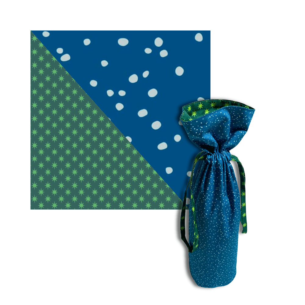 Make every gift feel special with this reusable fabric gift bag, thoughtfully designed to fit wine bottles, candles, and other tall treasures. Crafted from soft, durable fabric, it’s a stylish and sustainable alternative to disposable wrapping—perfect for hosts, holiday parties, blind wine tastings, or everyday surprises. The reversible design features two festive prints: a deep blue with scattered white dots reminiscent of a starry night, and a cheerful green with playful burst motifs.