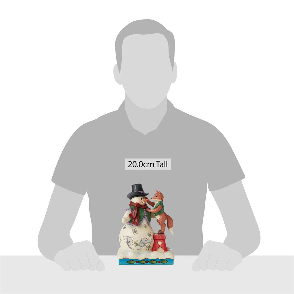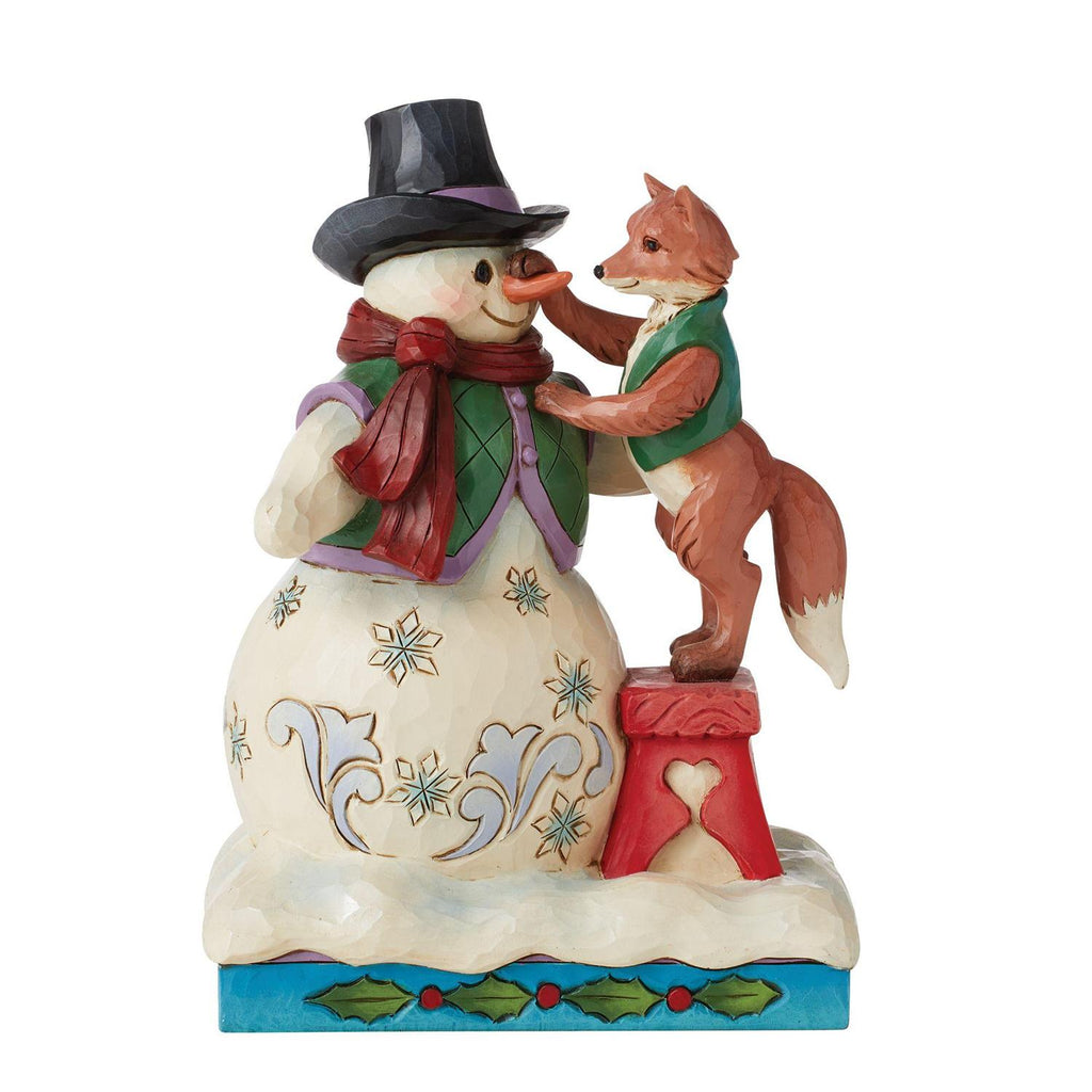 This charming Snowman and Fox are the 6th Annual Snowman and Friends statuette in the Jim Shore collection. Using a step stool, a green vested fox adjusts his snowman friend's carrot nose with care. Smiling together, friendships keep winter warm.