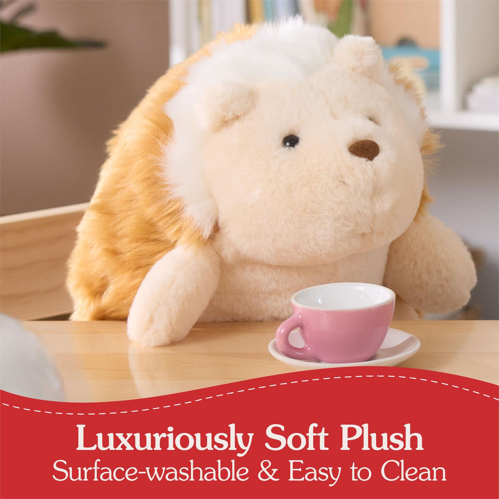 - HEDGEHOG PLUSH: Tea is a beautifully crafted hedgehog with super-soft chestnut-colored plush material. This crescent-shaped hedgehog sits at 10` and has a curved shape designed to look into your eyes, making a special, cuddly moment of every squeeze!