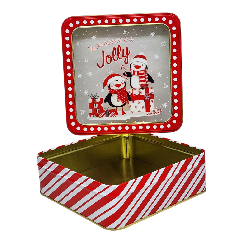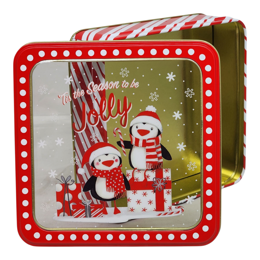 Get into the festive spirit with our Jolly Penguins Cookie Tin! This charming square tin showcases two adorable penguins decked out in their winter gear, complete with cozy scarves and hats, as they celebrate the season surrounded by colorful presents. With the joyful phrase “Tis the Season to be Jolly” beautifully displayed, this tin captures the essence of holiday cheer, making it the perfect spot to stash your seasonal treats. The clear acetate window on the lid provides a delightful sneak peek at the delicious goodies waiting inside, adding an element of surprise.