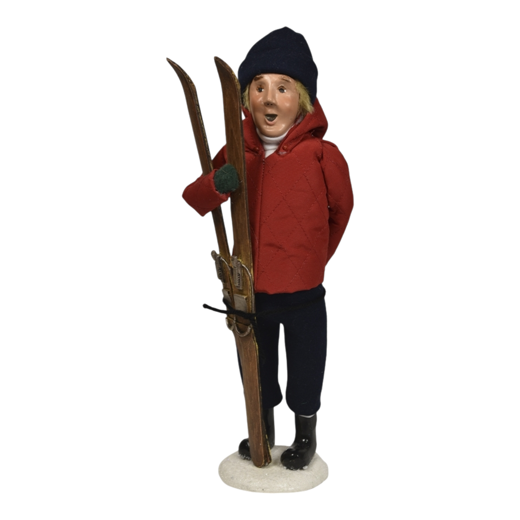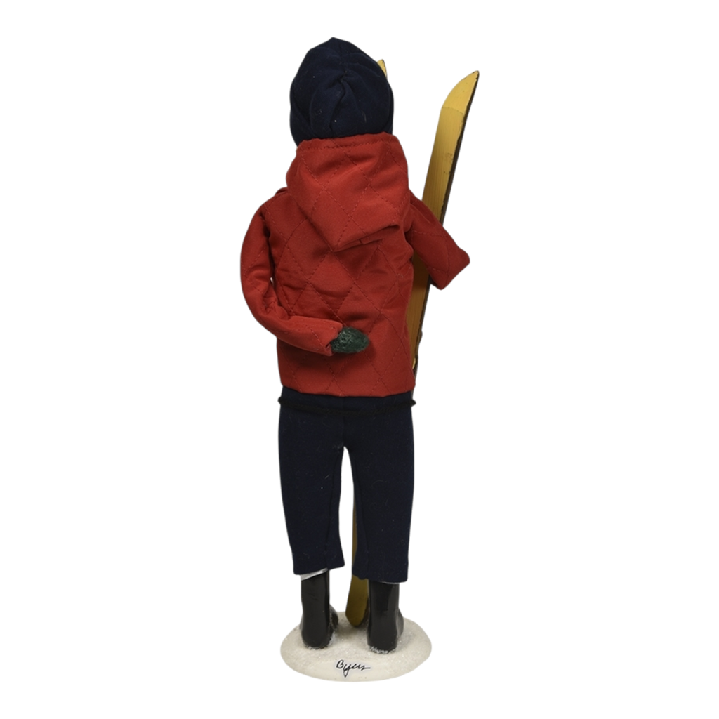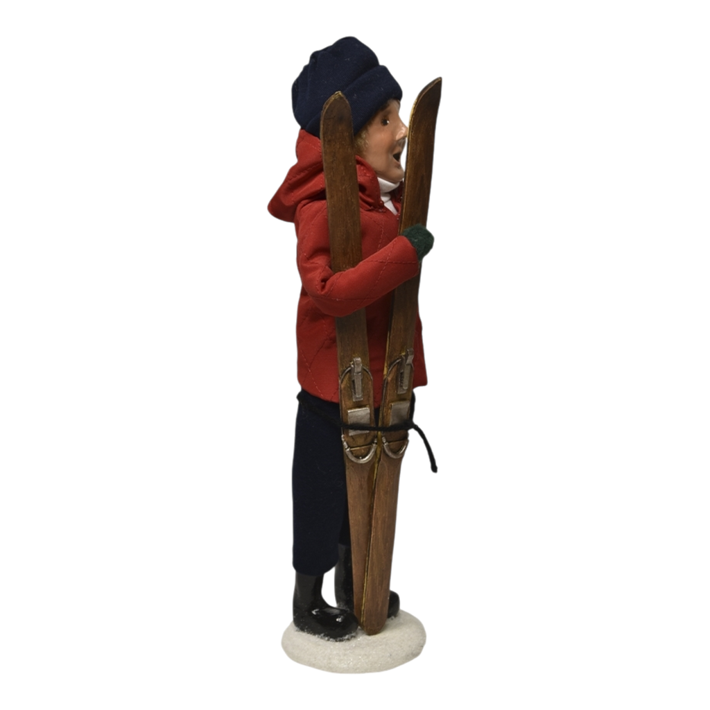 Celebrate the exhilarating spirit of winter with the charming Winter Sports Family - Skiing Man figurine! Standing at an impressive 13 inches tall, this delightful Byers’ Choice collectible captures the essence of snowy mountain adventures. Dressed in a cozy red quilted jacket, warm hat, and stylish ski pants, he holds his set of skis ready for a thrilling day on the slopes. With a bright expression and an air of excitement, this skiing enthusiast embodies the joyful spirit of outdoor winter activities.