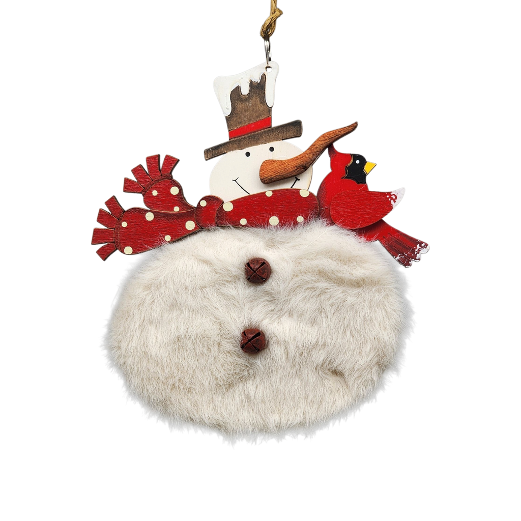 Wood and Fur Snowman Ornament - Red Scarf with Cardinal