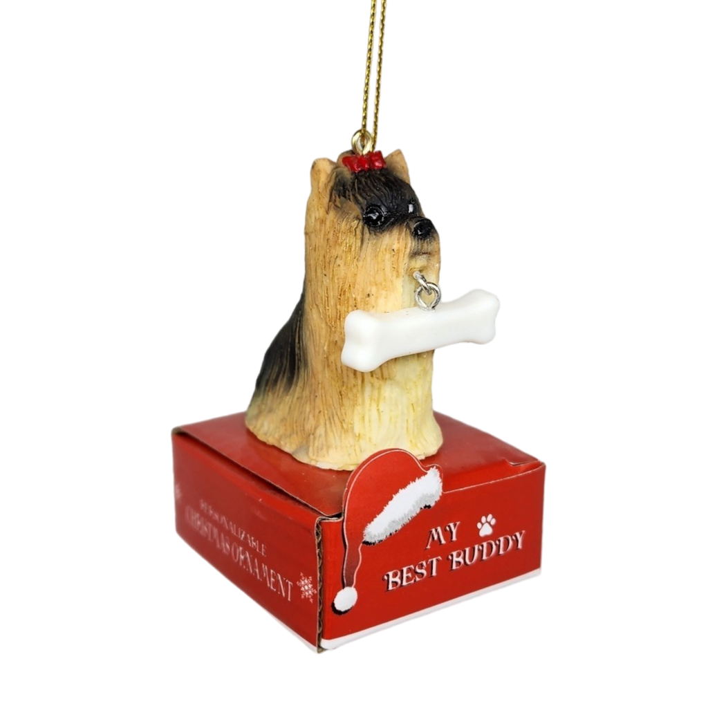 The ornament includes a personalizable feature— the dangling bone allows you to add your dog's name or a special message with a simple Sharpie Marker. Ready to hang with the included gold braided cord, the Yorkie with Bone Ornament makes a thoughtful gift for dog lovers and a sweet tribute to the unique bond shared with our pets. Embrace the joy and companionship that Yorkies bring to our lives with this delightful ornament, creating memories that will be cherished for years to come!