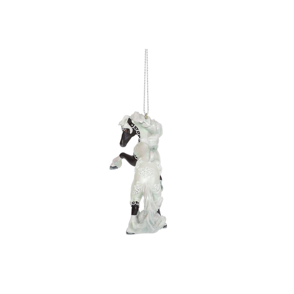 This exquisite ornament titled "Yuletide Chantilly Lace," designed by Lorna Matsuda, is a captivating addition to any holiday collection. Standing approximately 2.7 inches tall, this piece captures the elegance and charm of the festive season in miniature form. The ornament features a majestic black and white horse in a dynamic rearing pose, showcasing both movement and grace.
