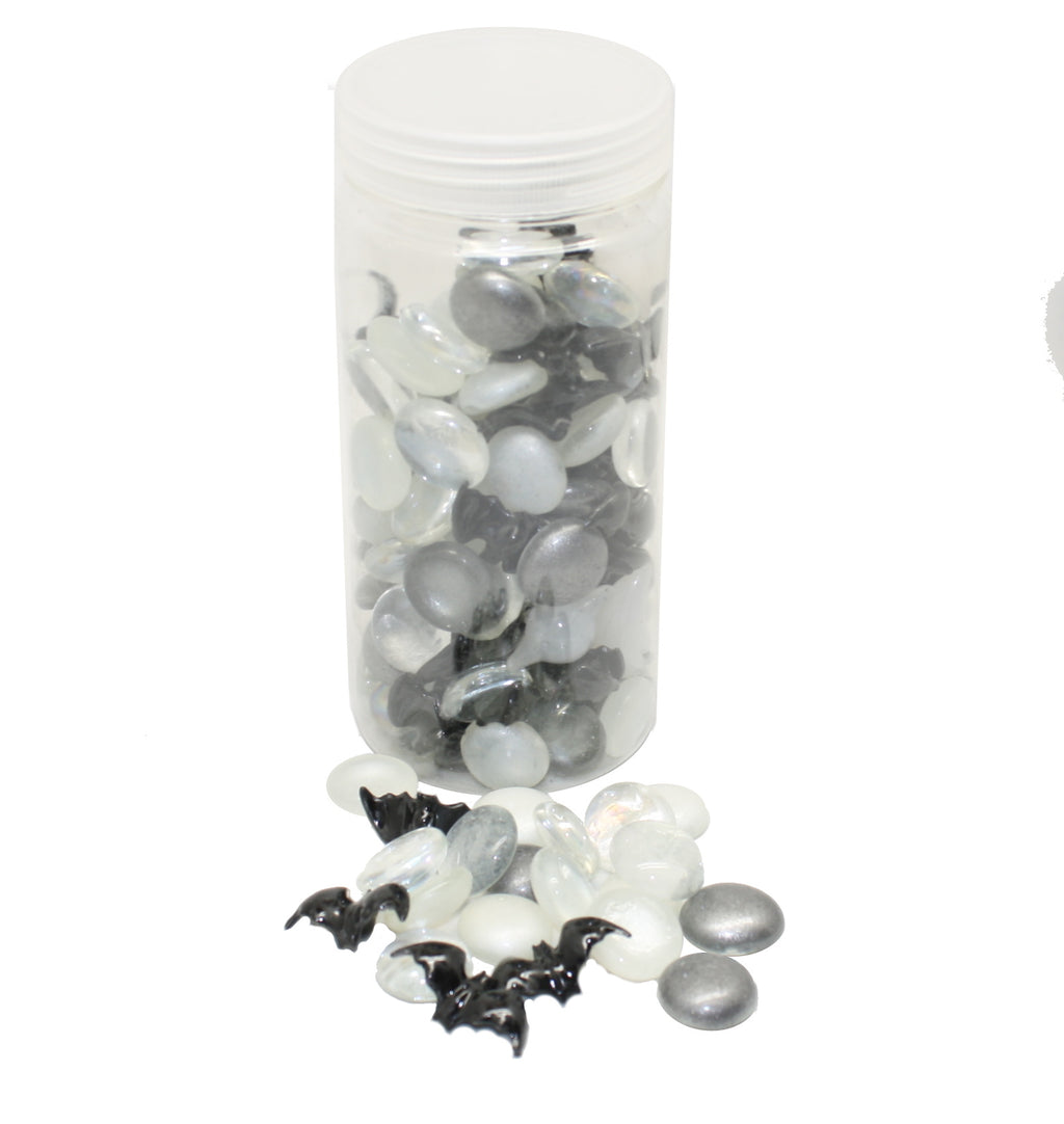 Get ready for Halloween with this spooky assortment of gems! This 1-pound container includes smooth clear, silver white and black stones, plus a few bats and ghosts thrown in the mix. Perfect for any craft project or decoration!