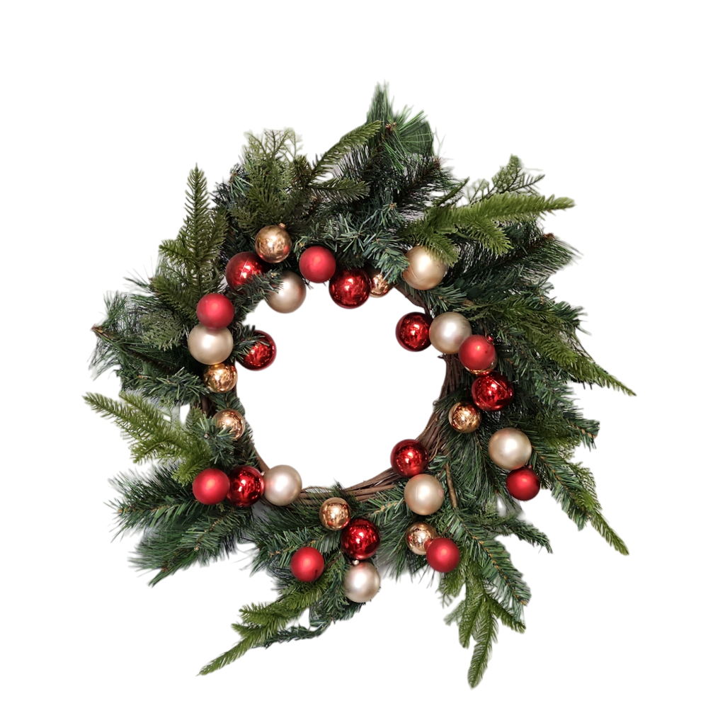 This wreath is the perfect way to welcome the holidays. Featuring multi-color balls sitting on realistic needles, this wreath is a great accent to any Holiday decoration. Perfect sign of the holidays all over.