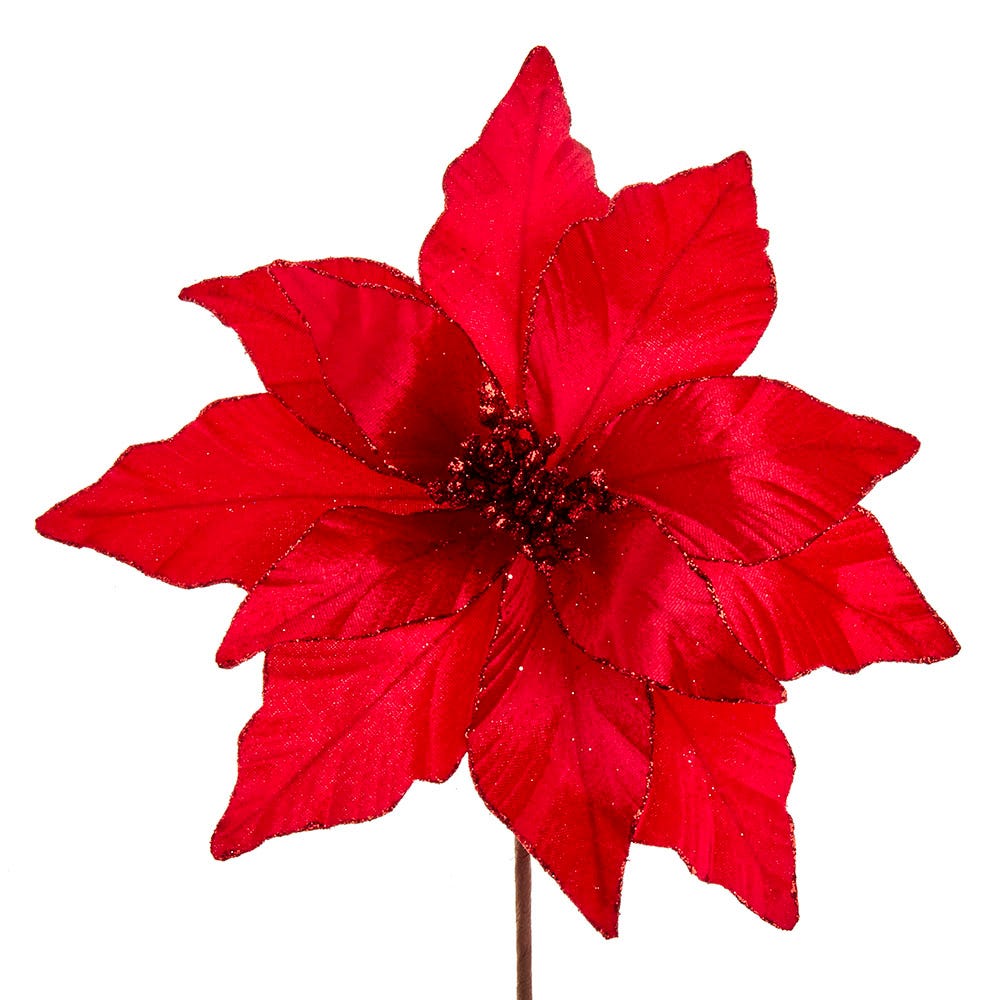 This red velvet poinsettia pick from Kurt Adler is a festive addition to your home or holiday décor. It features a red velvet poinsettia with red glittered accents. The wire design enables it to be used for a multiple of holiday decorating needs including embellishing a wreath or garland and adding just the right bit of sparkle to a wrapped gift.