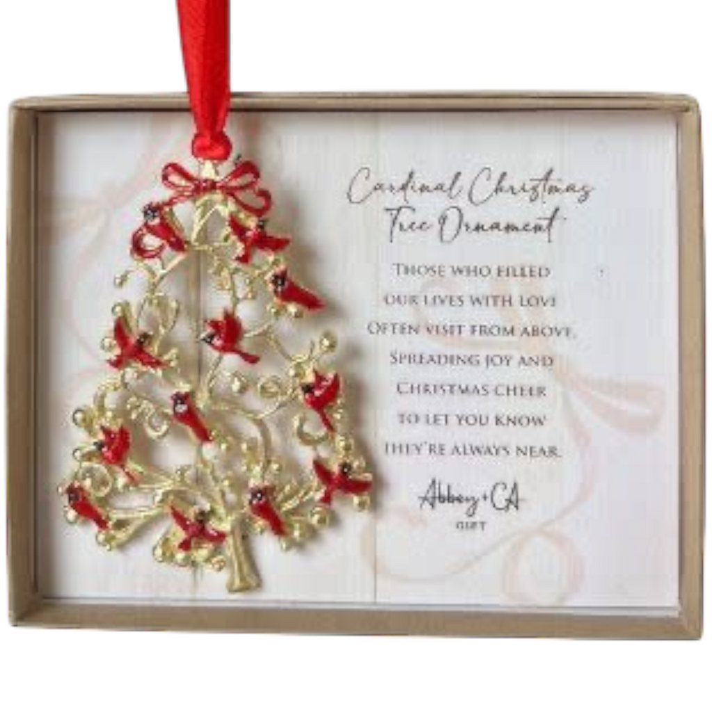 Celebrate the season with a heartfelt tribute to loved ones past and present. This charming Christmas tree-shaped ornament features vibrant red cardinals perched among snowy branches, symbolizing the comforting belief that “cardinals appear when angels are near.” A red ribbon at the top makes it easy to hang on your tree, wreath, or mantle, adding a touch of warmth and remembrance to your holiday décor.