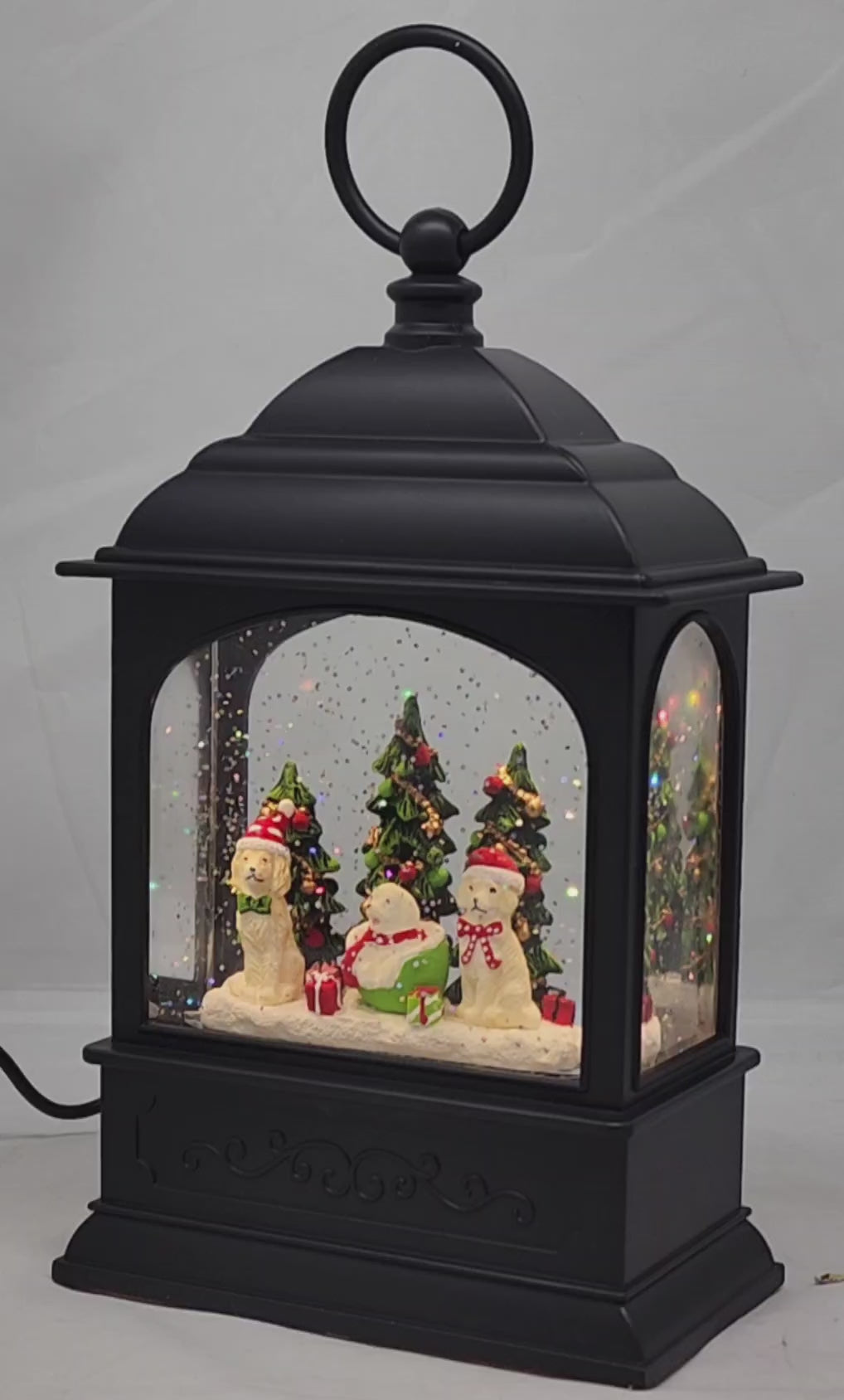 Illuminate your holiday decor with the enchanting 8.5-inch "Celebrate the Season Pup" Lighted Water Lantern. This charming lantern captures a delightful winter scene featuring adorable pups frolicking in a snowy wonderland, surrounded by festive trees. With its classic black frame and intricate detailing, it adds a touch of elegance and whimsy to any setting.