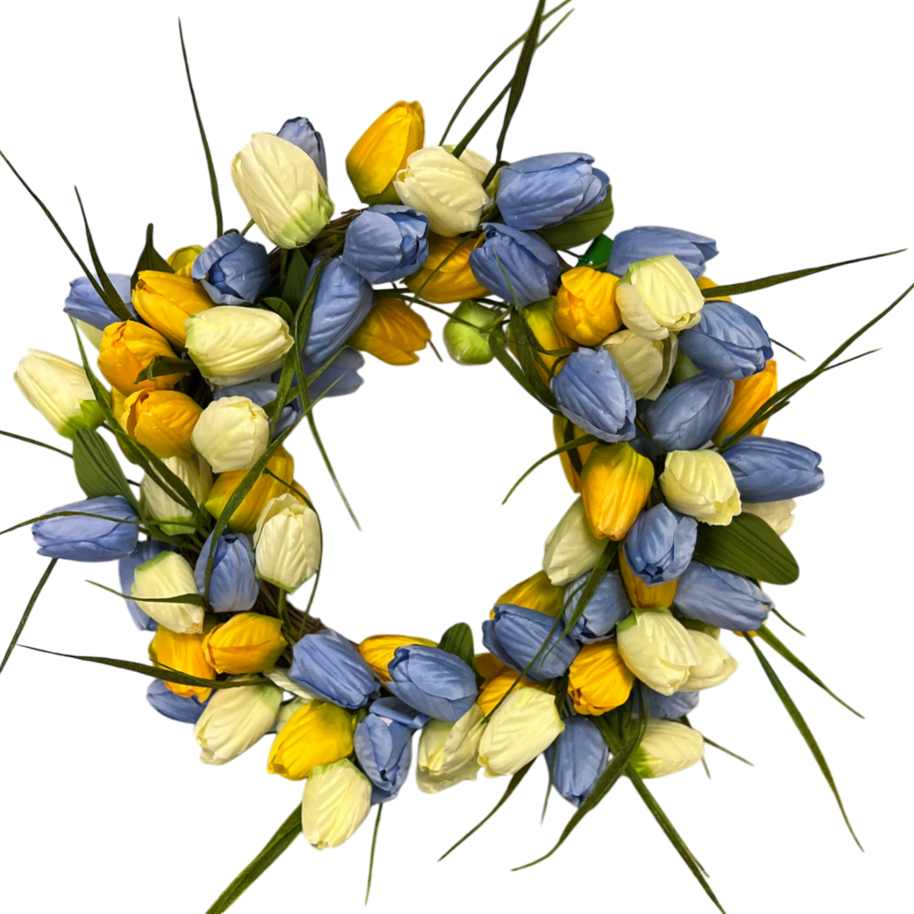 - Wreath measures 16 inches diameter x 4 inches deep, tulips are on wired stems